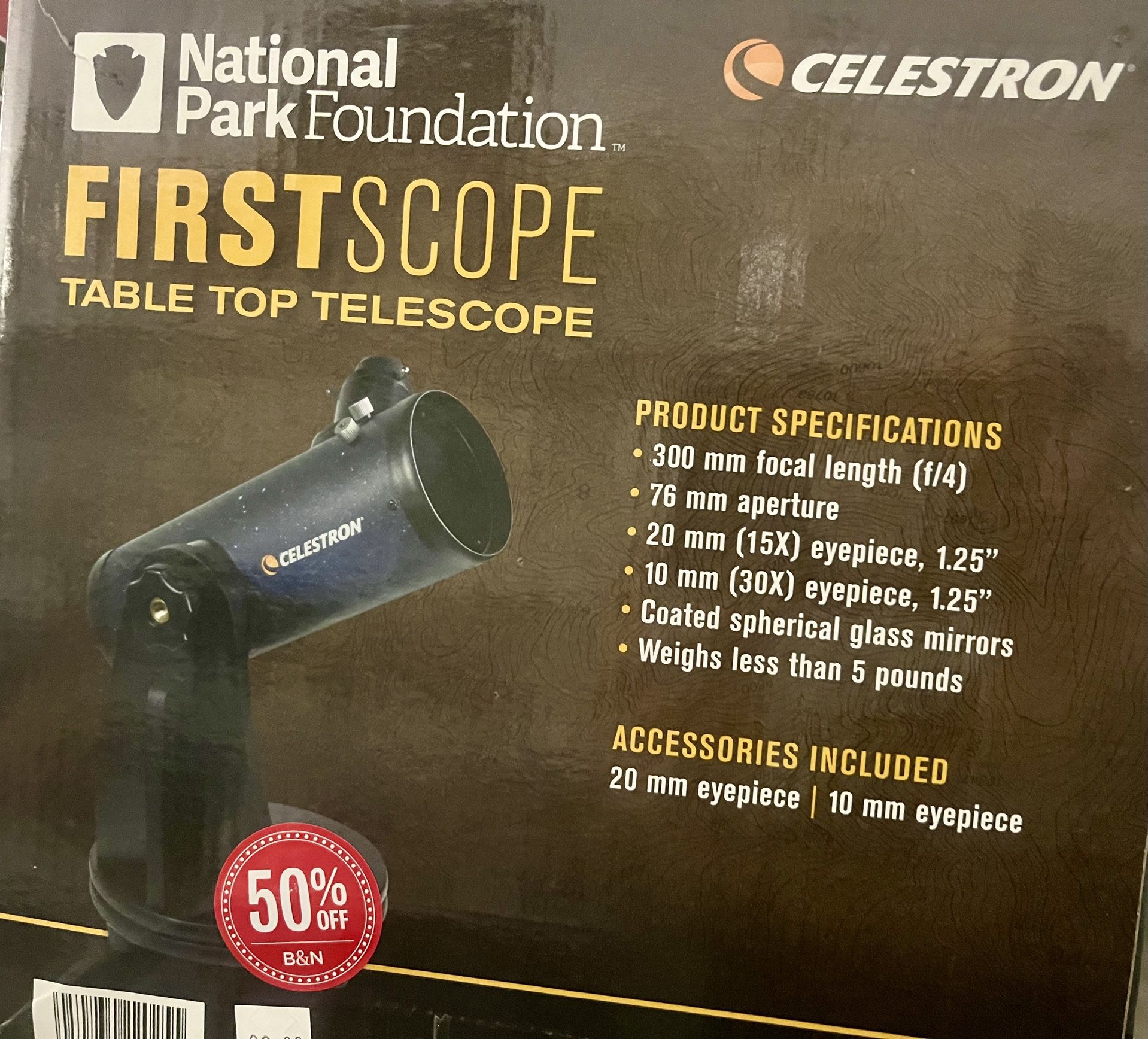 FirstScope Tabletop Telescope- A compact tabletop Dobsonian reflector,known for its simple wide field of view lightweight and portable.