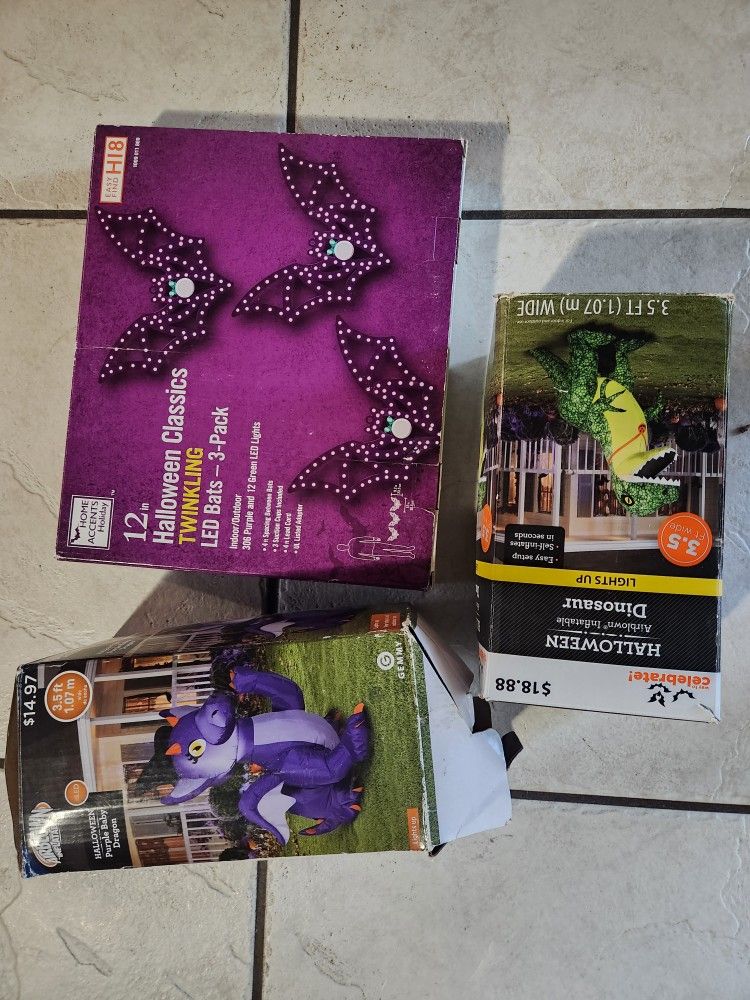 Multiple holiday decorations included Halloween inflatables (working) LED bat lights Christmas candy cane pathway lights Light-up reindeer and other décor All items tested and working (inflatables may need bulb replacement inside) Selling as bundle only Pickup only Westchester