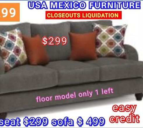 Closeouts liquidation item save up to 70% off Brand new loveseat only $299 Regular $ 600 Sofa $ 499 Only 1 left Cash value savings! Do cash and save! Card or finance is available for just 7% more Please call for inventory item may not be available or on display thanks If any questions please call 909*214*9733 Or visit us in any of our 3 locations ( plea ask for address) USA MEXICO FURNITURE Hello guys how are you doing today please let me know if you need some furniture some mattresses for Your house for Your family we have 3 locations to serve you better We do offer finance 100 days same as cash 0 % interest no credit required no money down and also 12 months finance is available We always take care of our customers almost 20 years on customer service We also do price match . lowes prices guaranteed Happy customers = great reviews Note: please call for inventory Item may not be available or on display We have a big variety of dining tables chairs sofa loveseat sectionals bed frames in twin full queen king more than 100 different mattress box spring bedrooms sets dresser mirror nightstand chest Vaniy mirrors all brand new FURNITURE and mattress not refurbished UEIQ