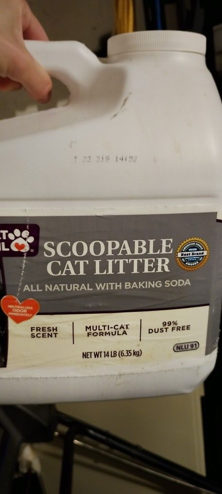 - Layered cat litter box (never used the layers, just the 2 of the litter trays) - UNOPENED Arm&Hammer Double Duty cat litter - Half used jug scoopable cat litter - 1 metal litter scooper (scrubbed clean but going right back there) - 1 plastic scooper, red