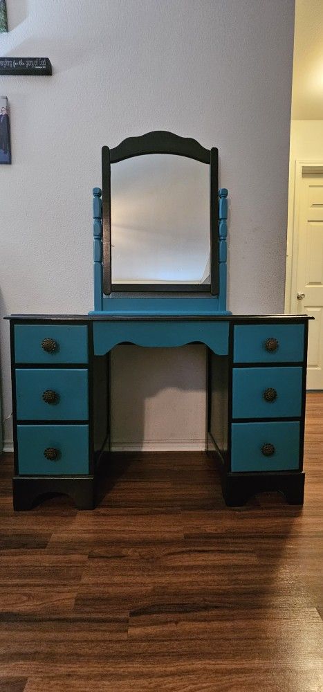 This is a solid wood vanity that has been hand painted black and teal. The drawers have been lined as well. Very solid and sturdy. Pick up only. Measurements: 44'" wide, 18" deep, 64.5" tall at mirror top, 29" at desk top