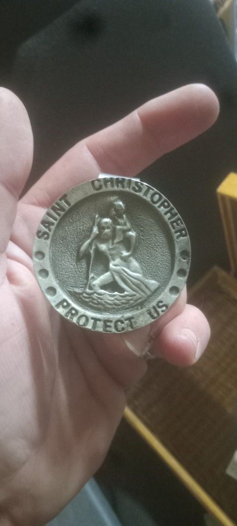 Vintage 1 7/8 inch fine pewter religious viso clip Saint Christopher protect us auto car visor clip In excellent condition No Knicks or dings No wore out spots Clip is not stretched out Looks like the day it was purchased brand new I have sold a lot of stuff in my time doing this and this is something I have never seen before so just a guess but I want to think it is a rare find. Anything g I find online about it says people are asking o er 80$ for it but I am just asking for 50$