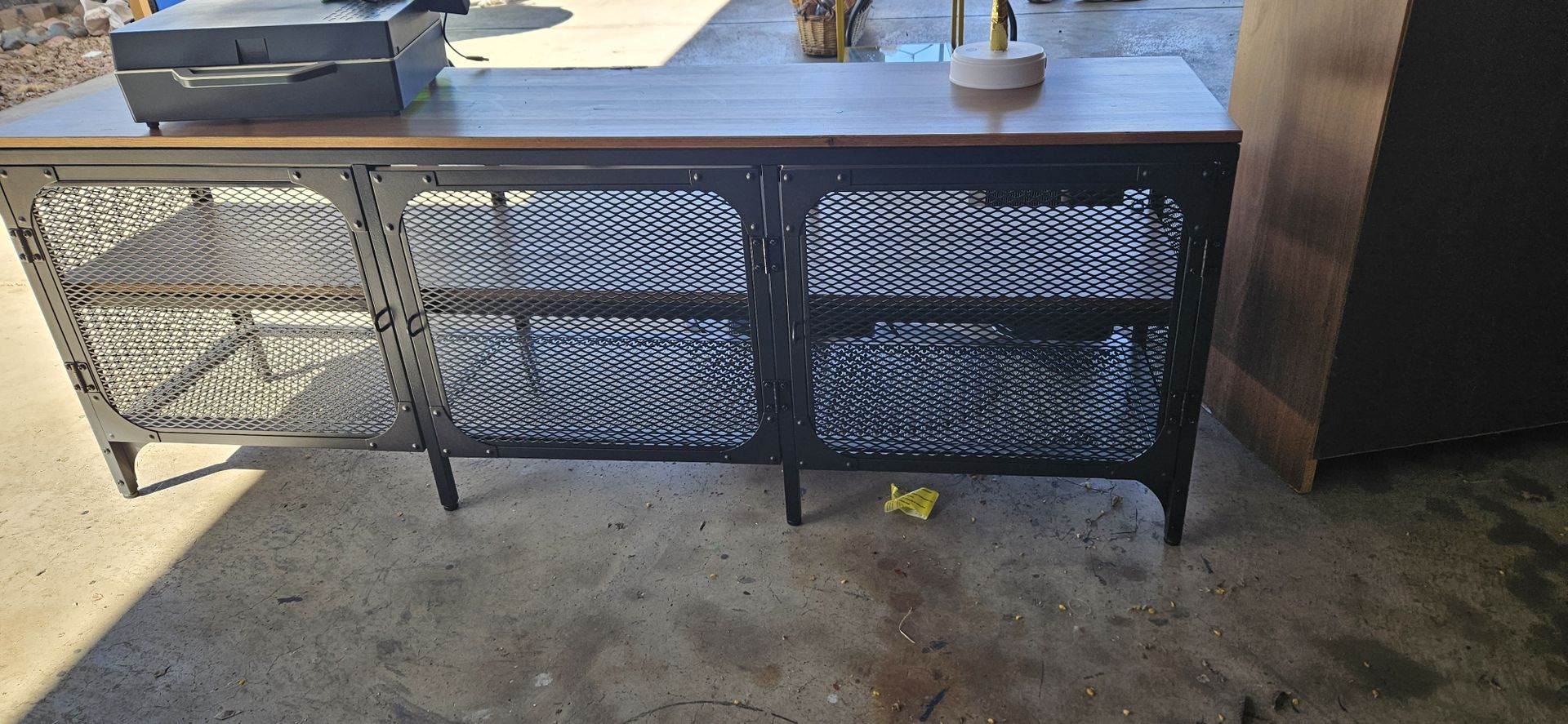 Nice tv cabinet with industrial look Metal mesh doors, wood top and shelf L...58.75 H...21.3 Depth...14