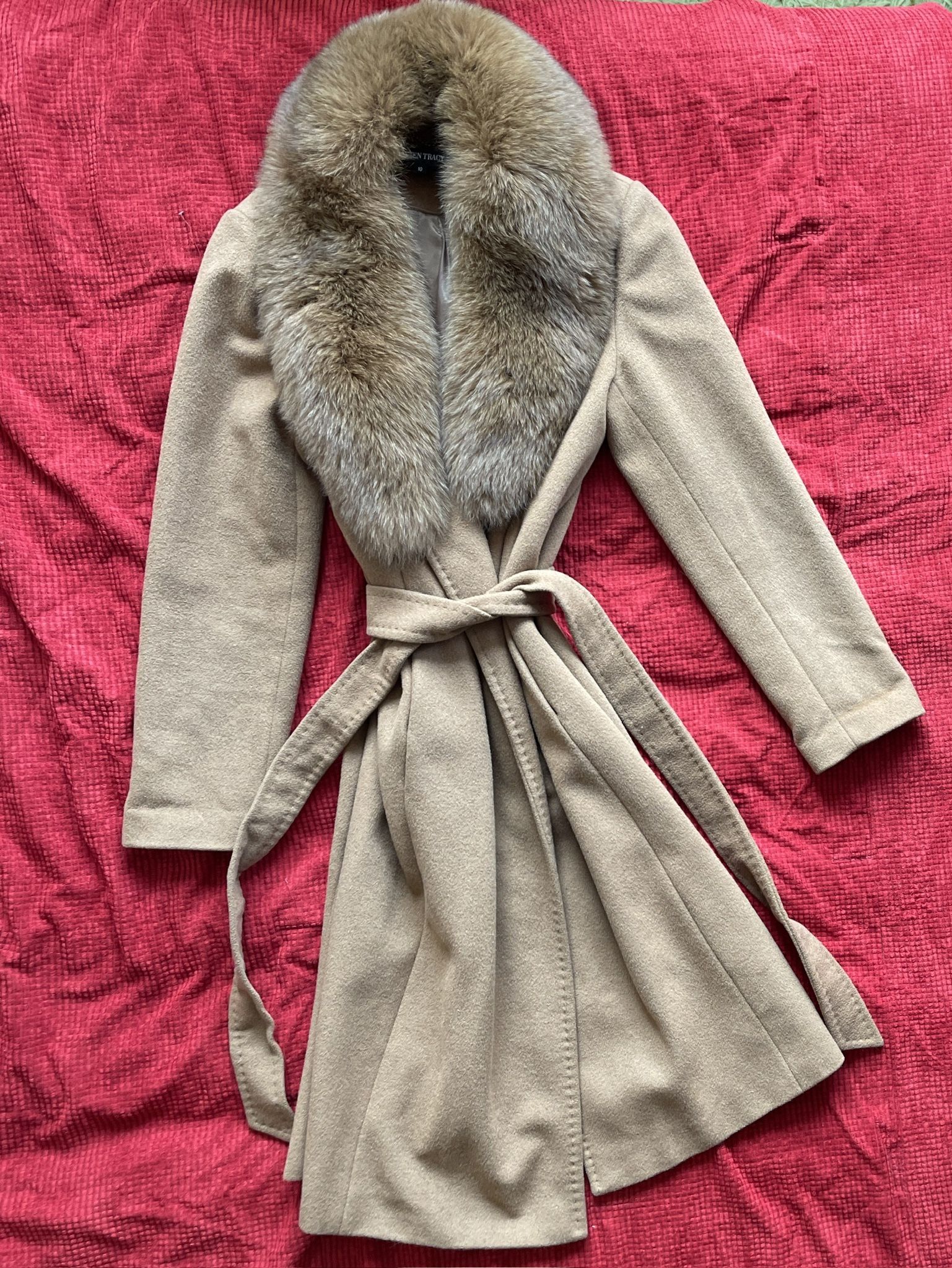 It’s real fox fur and wool blend, Ellen Tracy long brown/tan coat that reaches mid shin. Very stylish and the fur can easily come off. There’s one small rip in the lining, but it’s an easy fix and no one will see it because it’s inside. Pockets are in perfect condition The fur is well kept All in all it’s a beautiful coat and I won’t be needing it anymore because I’m moving to warm weather!