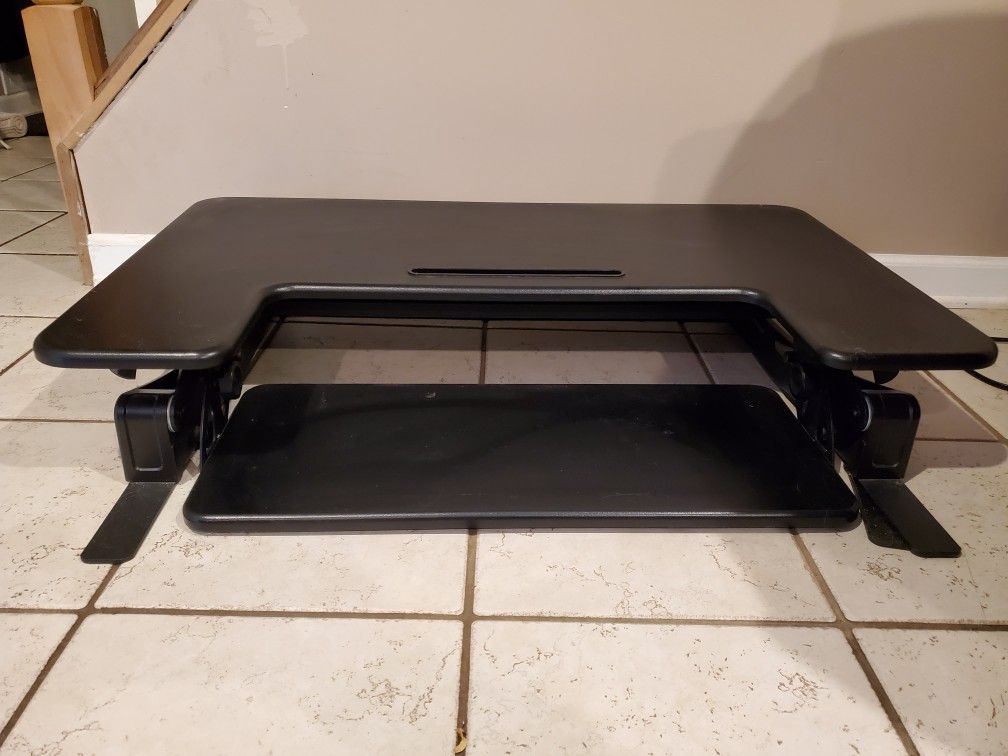 Black solid computer stand. Goes from sitting position to standing. This item is heavy!