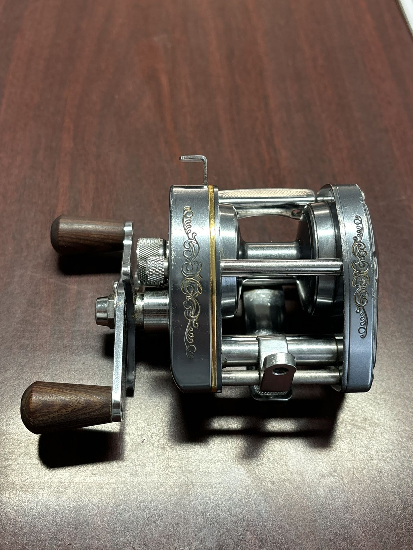 It was first introduced in 1978 and was a popular high-performance reel in the global bait casting reel market. The reel features a durable metal construction, a right-handed retrieve, and rosewood-style handle knobs. It has distinctive blueish gunmetal coloring and gold-colored engraving details on the side plates.