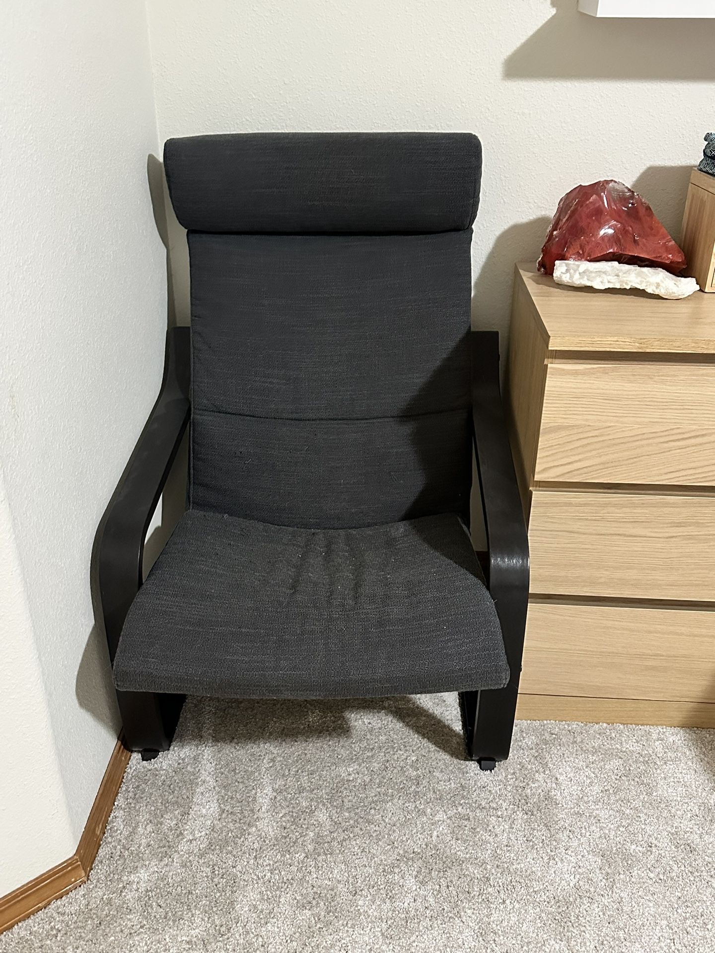 Black wood with grey cushion. Cushions have some pulls (see photo) New cushions can be purchased from ikea.