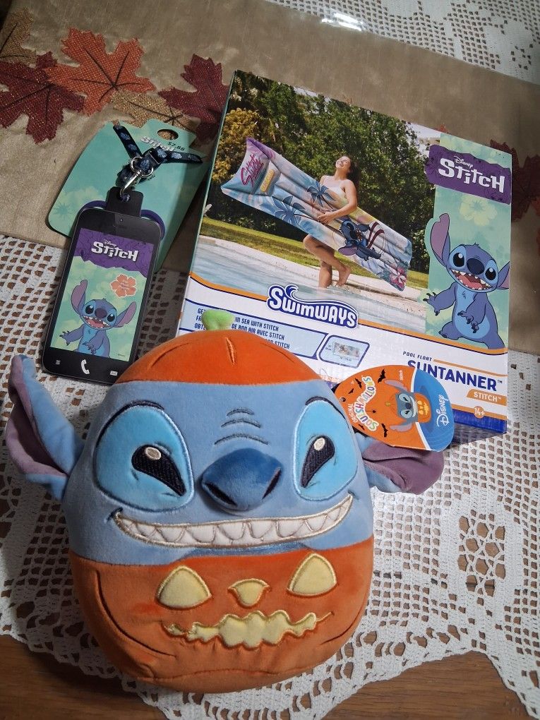 All new. Includes one pumpkin stitch plush, inflatable pool float, and a phone lanyard
