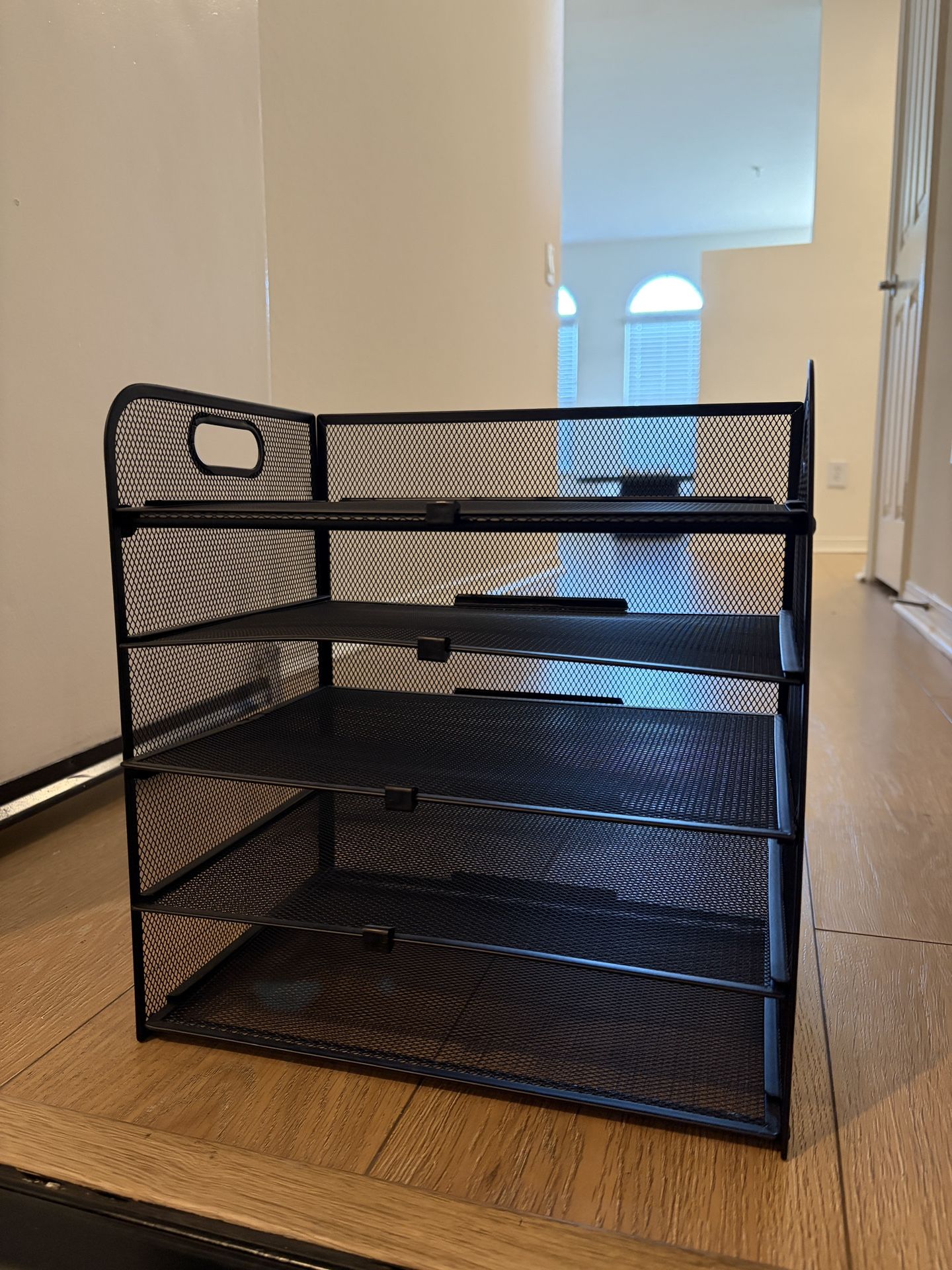Heavy-duty black metal mesh desktop file organizer with 5 spacious tiers. Perfect for organizing paperwork, folders, mail, or office supplies. Sturdy construction, modern look, and in great condition. Clean, no damage, ready to use. Great for: • Home office • Business office • Student desk • Mail or document organization Pickup only. Cash or Zelle preferred.