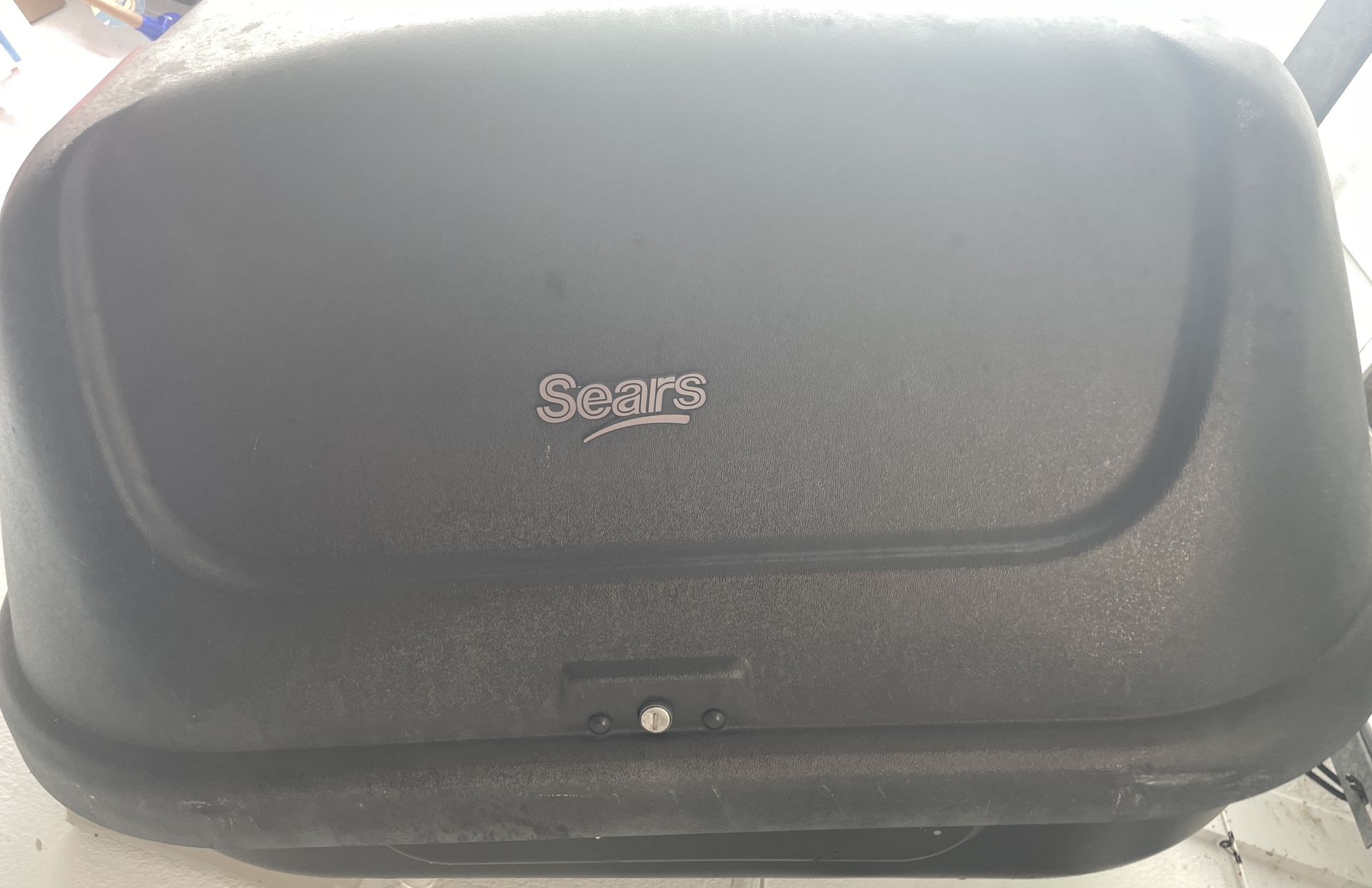 Sears Cargo carrier, attaches to roofrack of vehicle, large, lockable. There is a crack in front left corner sealed with Gorilla weatherproof tape, no water intrusion since applied!