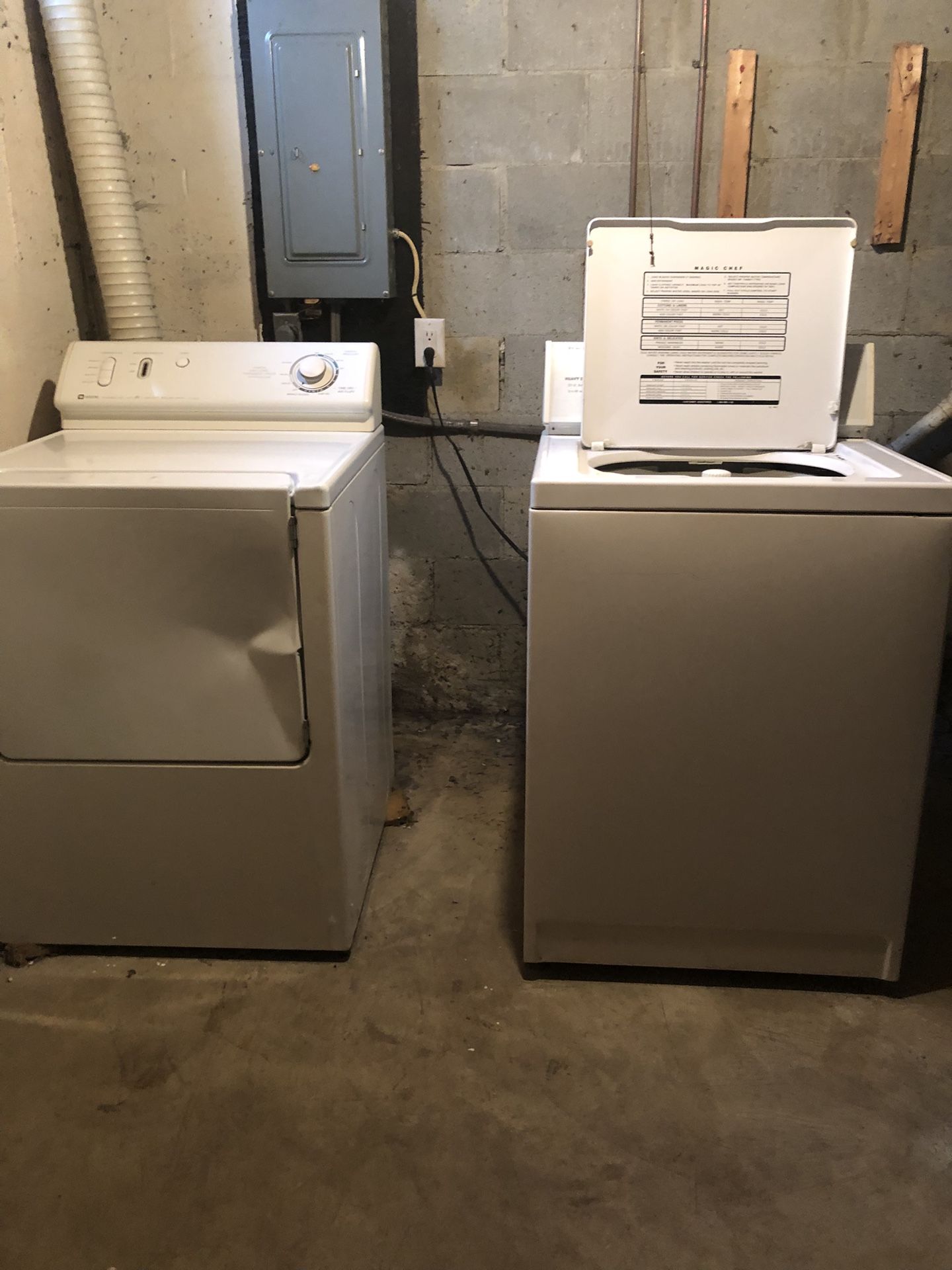 Magic Chef Washer and Dryer set the dryer has a ding in the door but closes and works perfectly. No issues with the washer runs great. The dryer is a front loader the washer is a top loader