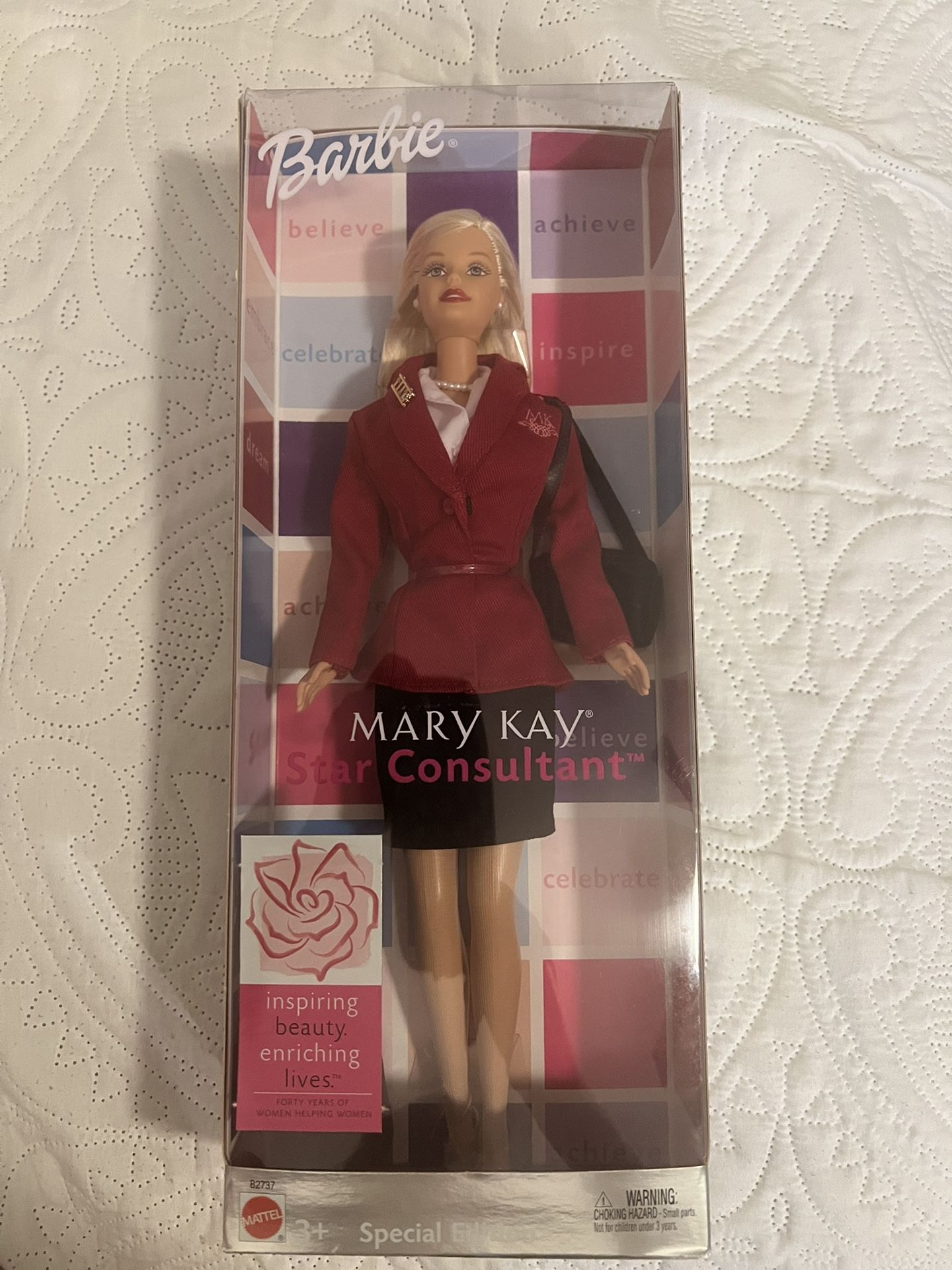 This special edition Barbie came out in 2003. It was created in celebration of Mary Kay’s 40th year beauty. The doll was made under the guidance of Mary Kay herself and had great details. It is the only Barbie that wears pantyhose. This is new in box, never opened.