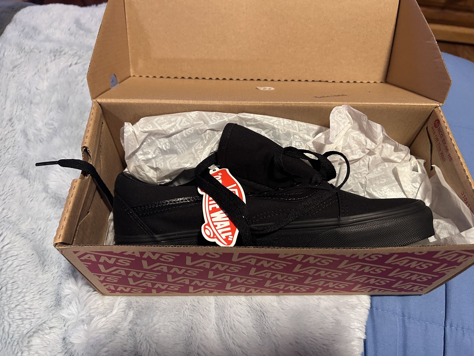 Really nice old skool vans brand new never taken out of the box or laced up black with black soles. They retail $70 at the vans store asking $50