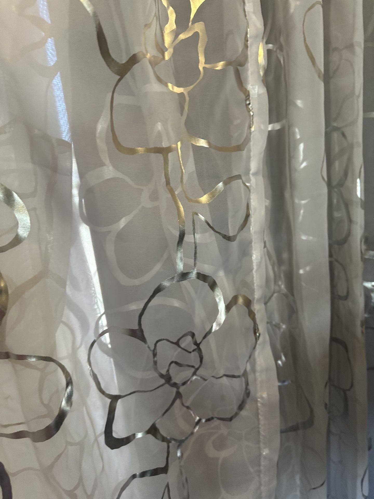 Great for use in a girls bedroom or classroom. Brushed nickel rod 48”-70”. Each panel is 82” in length and 36” wide. Has a silver flower pattern.