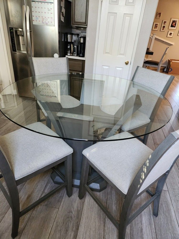 Counter height dinning table with four chairs, clean and very well taken care of. Top glass was always protected, not scratched.