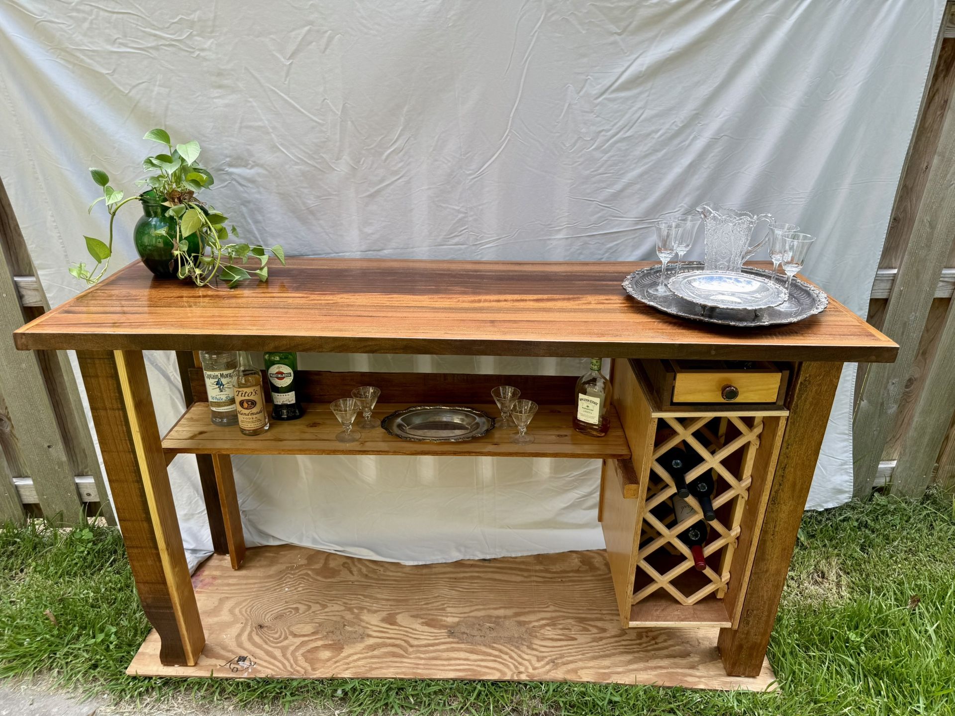 Home-built rustic table a blend of walnut, oak, pine, and maple wood. Overall Dimensions: 76” L x 24.5” W x 42.5”H Shelf dimensions: 50”L x 10”W Drawer dimensions: 14”L x 8”W x 3”D Holds 7 wine bottles. ***Accessories & bottles not included*** Cash only. Located in oceanview area of Norfolk. Details can be discussed by reaching out to Dennis at 757:373:5365.