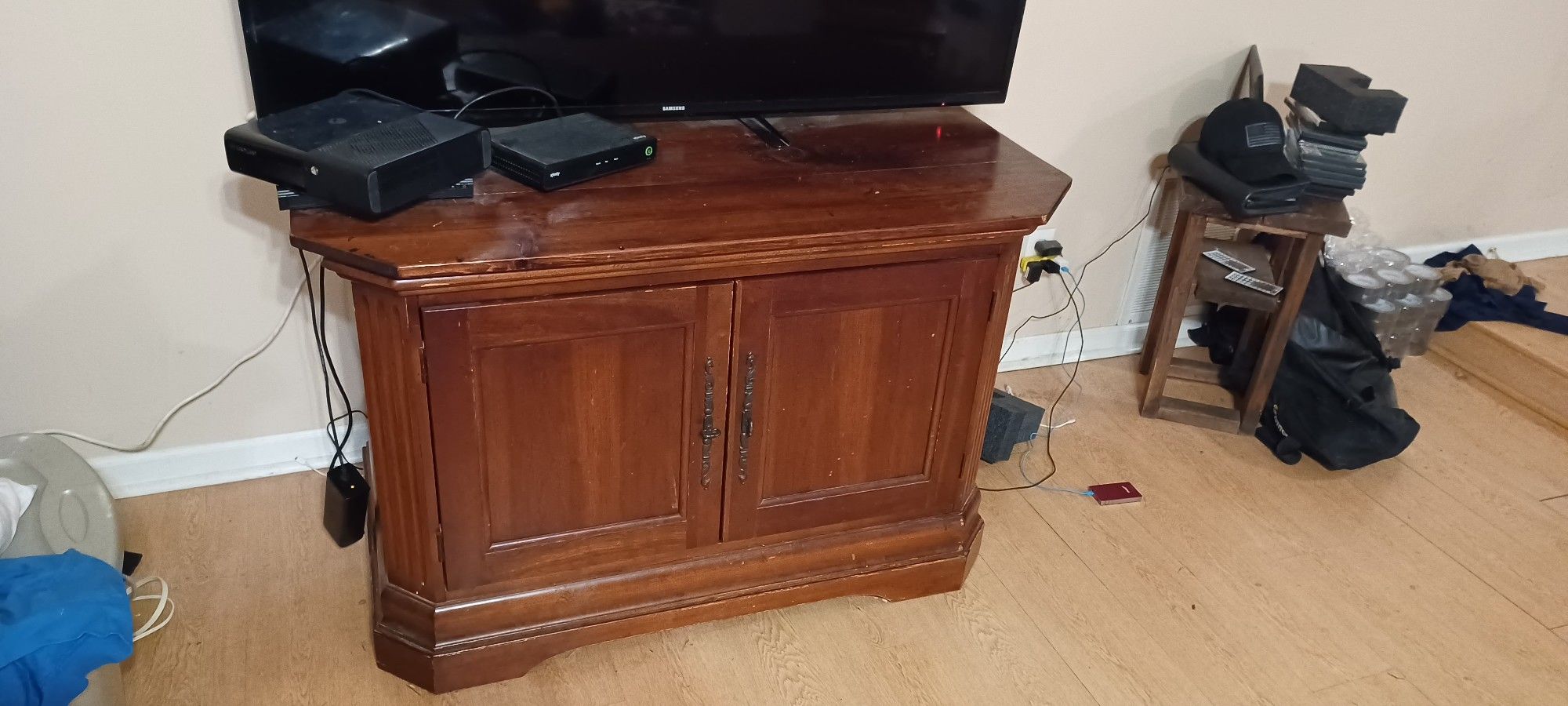 This piece is made out of hardwood and I made it myself. So great stand to place all entertainment stuff inside, has slide out storage shelves and an internal wiring harness so hide wire hook ups. I have to be moved out of my house by the day so it really needs to be picked up today, so please serious offers only 32" tall, 57" wide, 27" deep