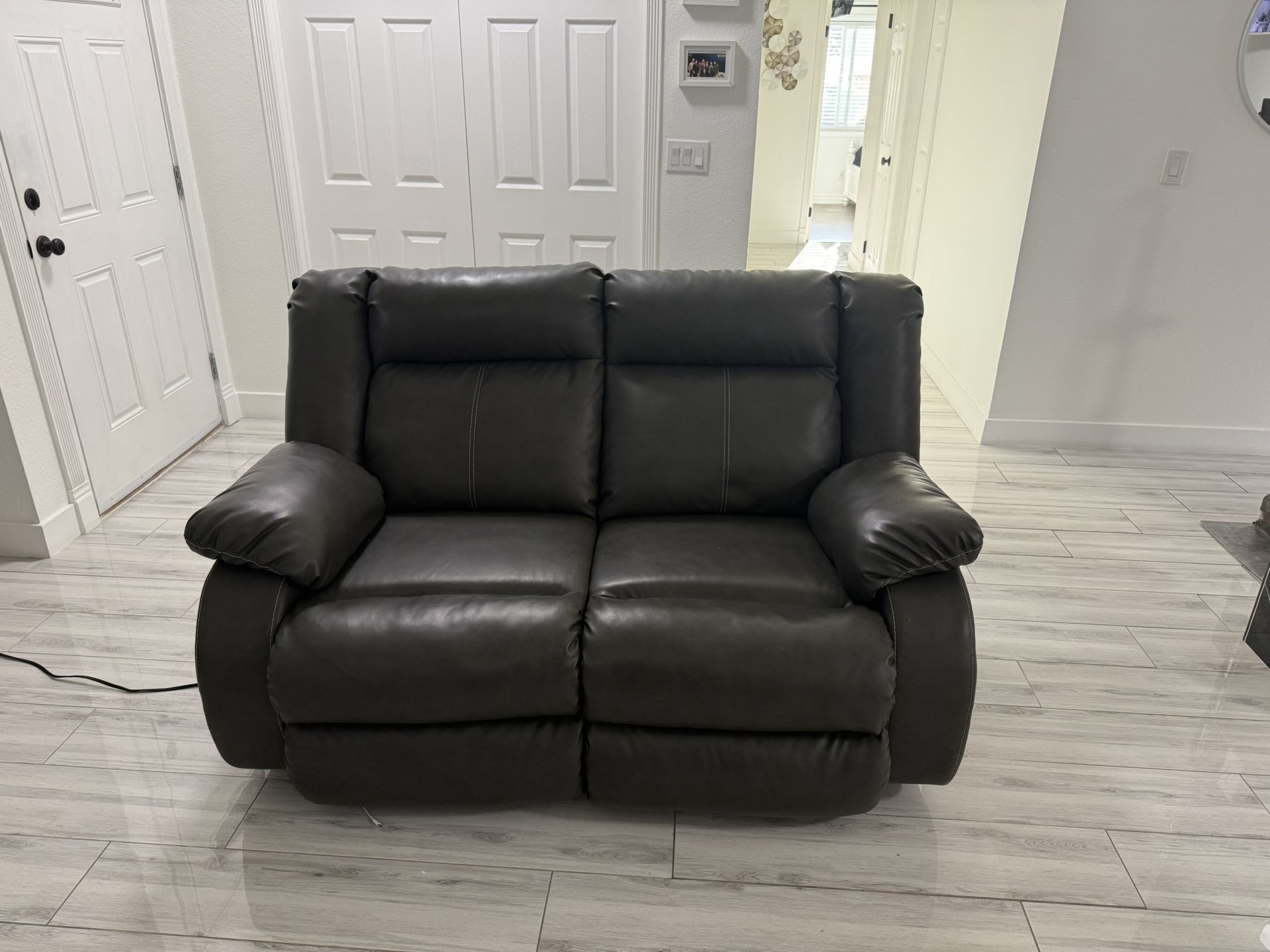Power Recliner Love seat with 2 USB Chargers One each side . 1 mont old. ((Will deliver for free)) Dark great leatherette