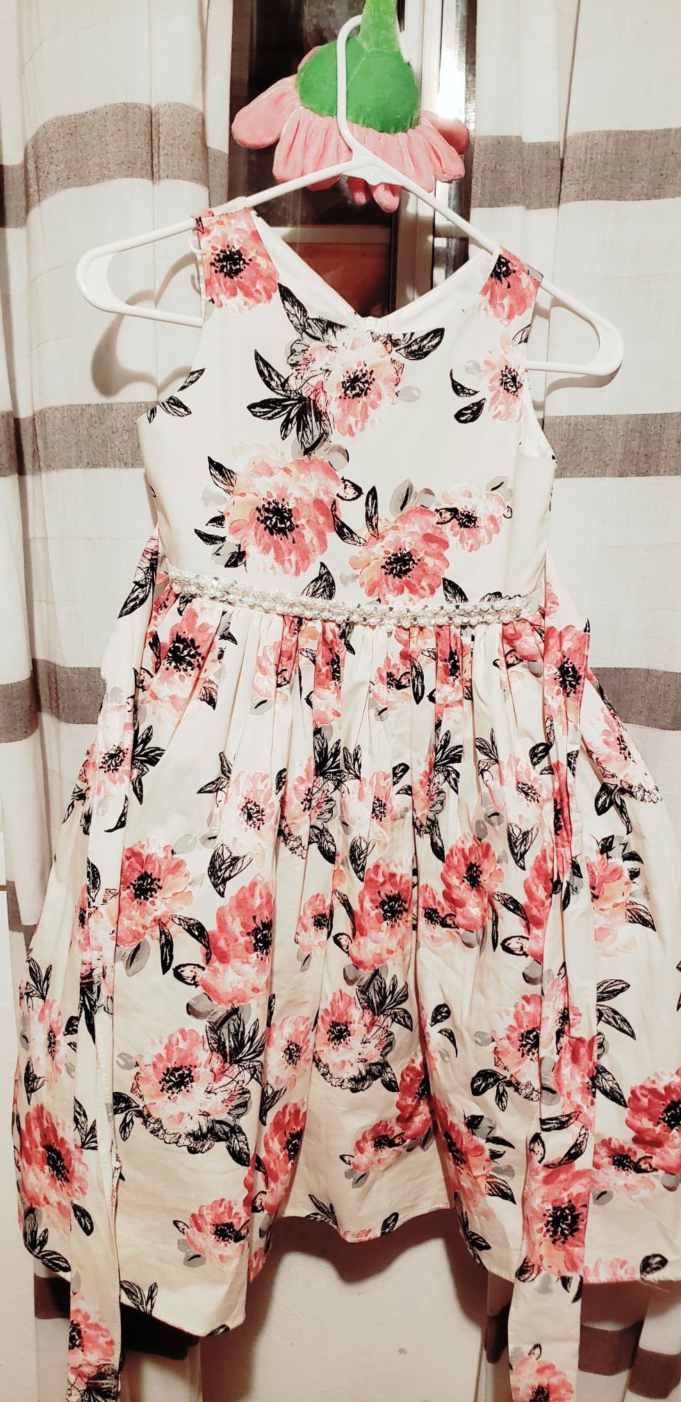Size 8 Flower print Has beaded/pearl belt around waist Zips up and ties in the back Worn once for my wedding last year