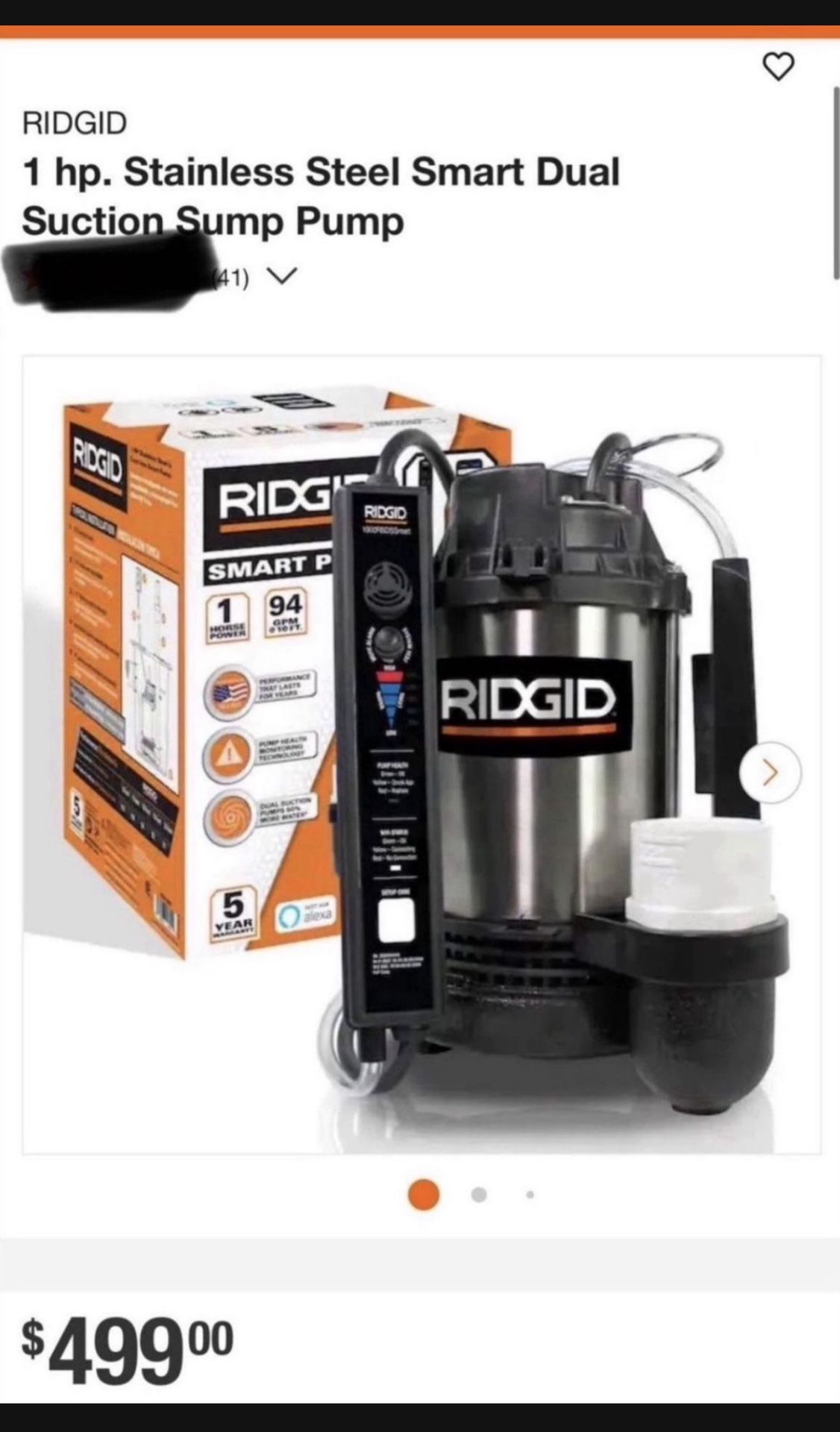 Payment Methods : Cash, Zelle & Credit Card with 8% additional fee π³ ((((( Item description )))) (((Retail price with tax $550))) The 1000RSDSSmart sump pump delivers the best-in-class ultra-quiet pumping power you expect from a RIDGID pump and adds on industry leading smart home IOT technology. The innovative air switch extremely durable - it surpassed 5,000,000 test cycles. That is 50 times more test cycles than some competitors! The digital controller and mobile app manage the 1 horsepower motor within the stainless-steel housing to deliver ultimate basement protection. The controller sends water level notifications, alerts you if the discharge is clogged, and even warns you when your sump pump is reaching the end of its life so you can replace it before you have a flood. The motor is able to pump up to 6,660 Gallons Per Hour (110 gallons per minute), the 1000RSDSSmart is The Hardest Working Pump You'll Never Hear. The submersible sump pump delivers dependable performance that lasts for years New innovative air switch is tested to 5 Million cycles. That is 50x more than competitors State-of-the-art iOS and Android app delivers control and insights to the palm of your hand Get TXT, E-mail and app alerts to replace you pump, this way you avoid a problem before it happens Receive pump maintenance notification and instructions on how to remedy common issues Dual suction design pump up to 50% more water than leading competitors Pump is easy to install, start to finish in about 15 minutes with no weep hole needed Corrosion resistant stainless steel motor housing and fasteners for long life in tough sump applications Sturdy and durable all cast iron dual suction volute resists clogging Reliable thermoplastic impeller delivers 110 Gallons Per Minute of water flow Pick up location close to CHASE BANK on 49551 US-27, Davenport, FL 33897