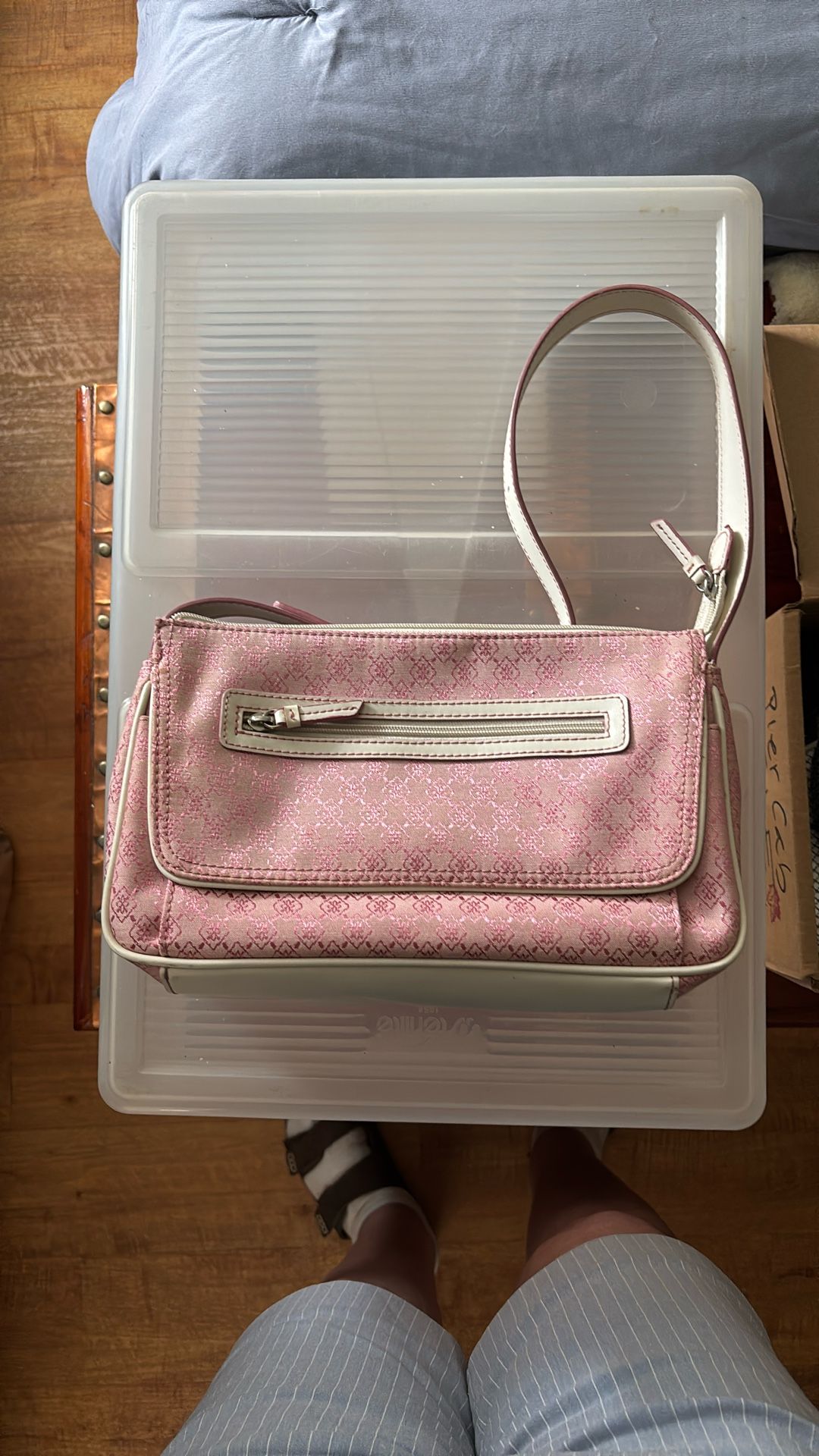 Pink printed fabric trimmed in white faux leather. White plastic top zipper and front side zipper. Back has one large open storage and inside has 2 open pockets and one zippered in beige to match interior lining. Excellent condition.