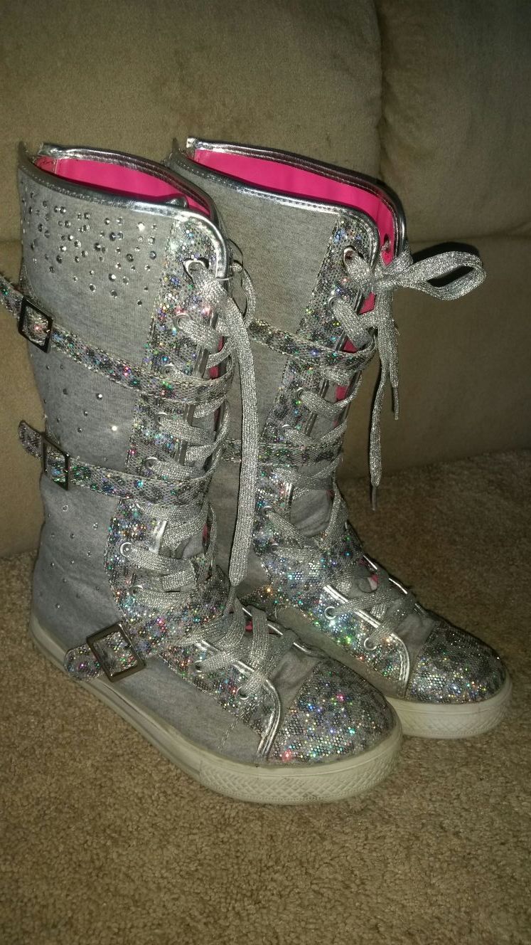 Cute sparkly boots from Justice size 7. Overall good condition except for the back part which you can see in the pictures shows where. And the white soles could use a little cleaning. Porch pick up only in Loxahatchee