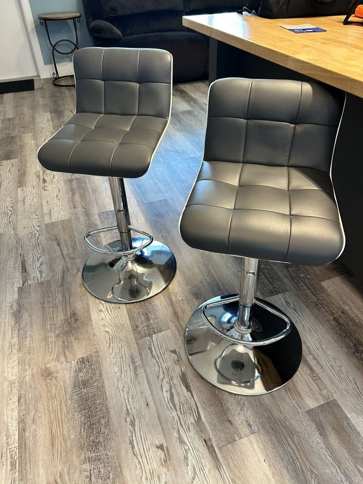 2 modern white and dark grey with chrome base adjustable height bar stools. In great condition. No rips or tears or peeling. Easy ground floor pick up.