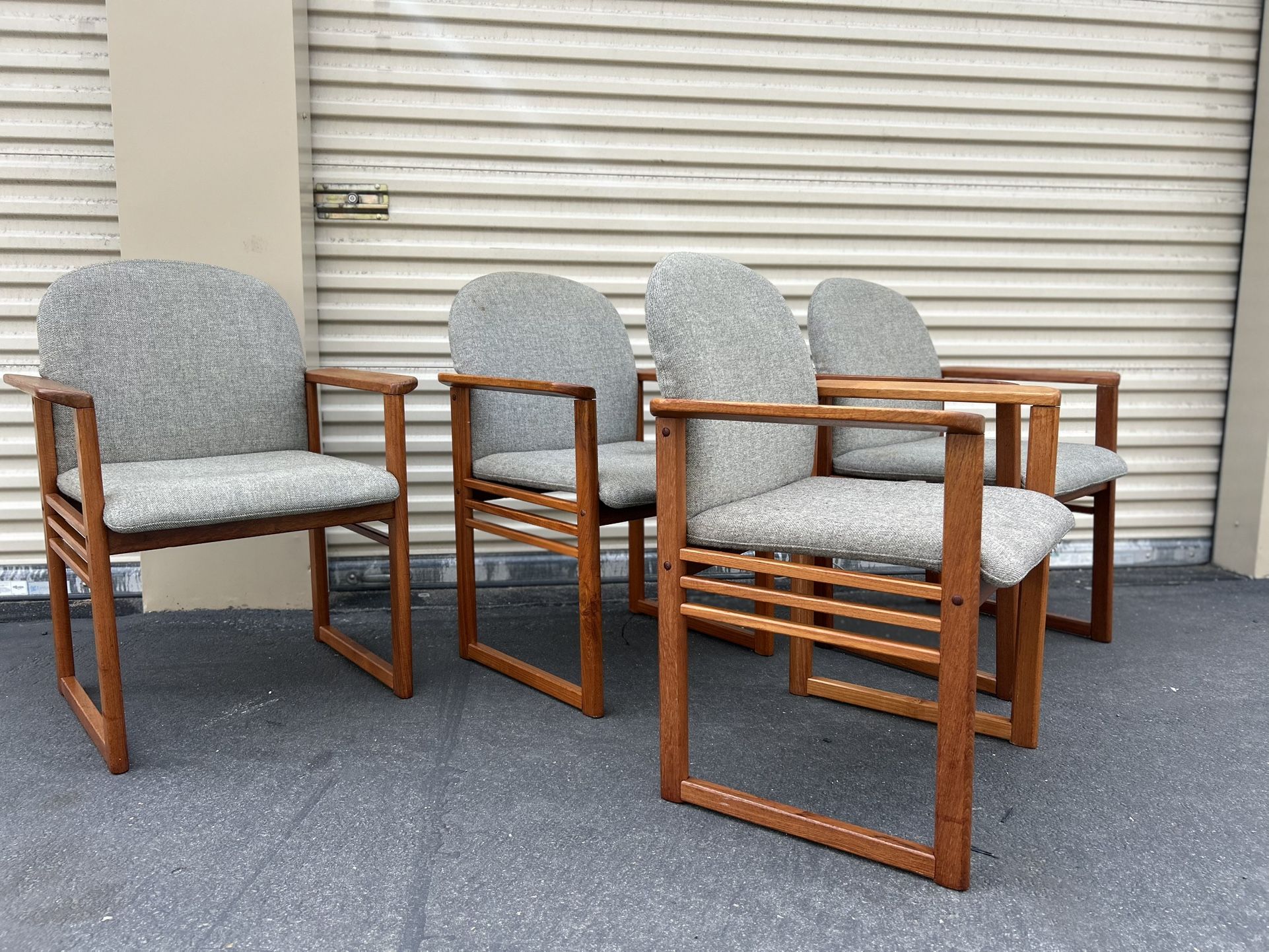 Beautiful teak dining chairs. Price for all 4 chairs, and priced according to condition. They all need a little work/m. 24.5 wide 21.5 deep Arm rest 24.5 tall 33” tall from floor to top of backrest Seat height 17.5 Cushion 19.5 wide x 18 depth Asking 350 for the set ~mid century midcentury mcm modern Danish teak dining chairs seating dinner table chairs Denmark~