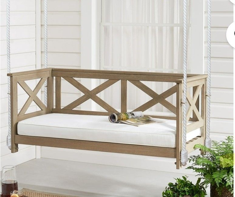 Brand new still in the box. $150 Create a relaxing outdoor space with this Hampton Bay two-person cushioned wood porch swing. The padded cushion lets you sit comfortably, while the natural brown wooden finish pairs well with the bright white cushion fabric. Made from solid acacia wood, this porch swing offers ample strength, reliable support and lasting use. Decorative cross bars along the side and back of this swing add style, complementing your outdoor modern aesthetic.