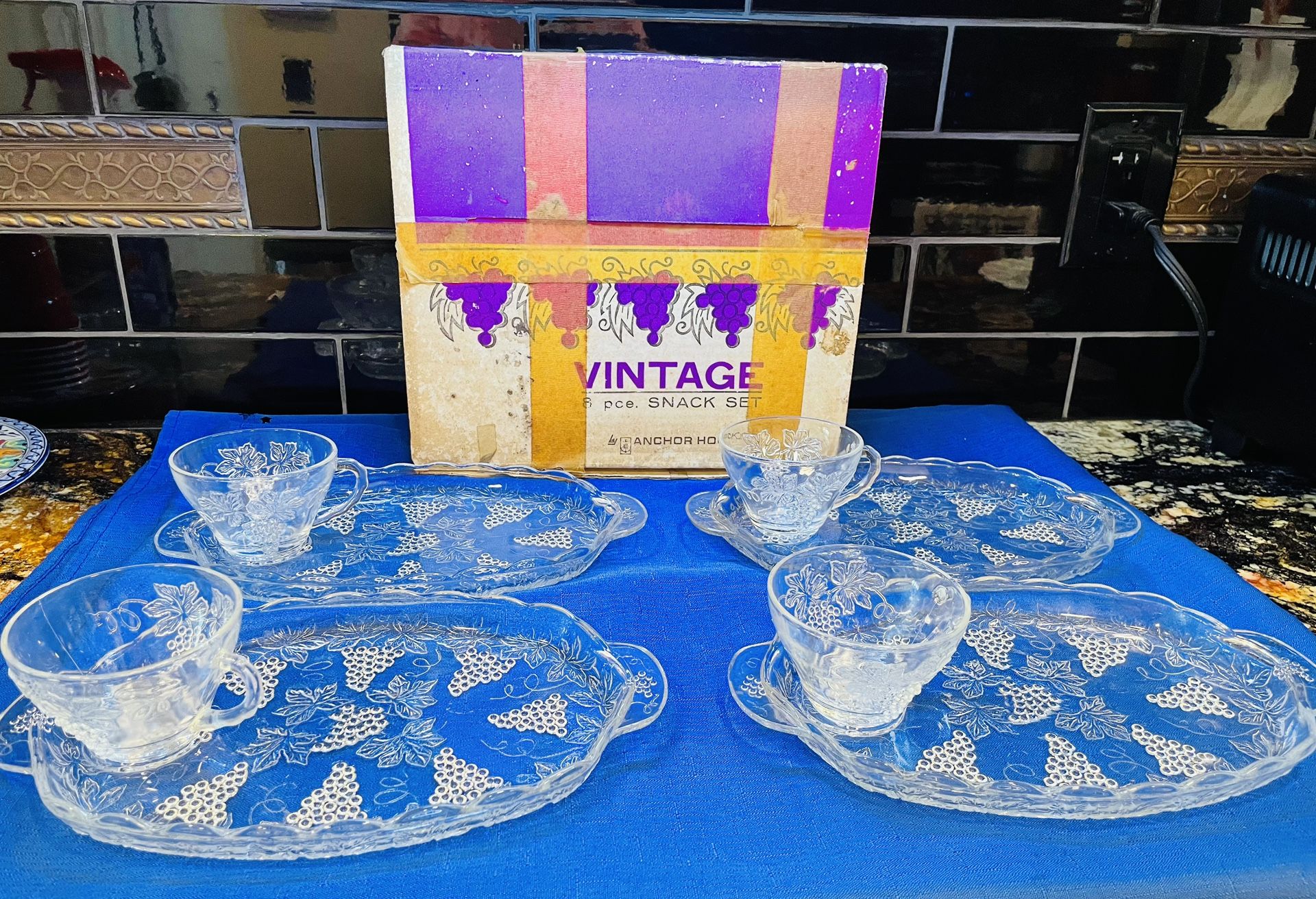Stunning vintage Anchor Hocking glass Serva-snack set with “ Grapes on the vine” design. Set of 4 in original box! Features plates in an oval shape with matching coffee/tea cups that fit perfectly Into the circular depression on the plate. Perfect for any luncheon/tea party or meal. 11.5” L X 7” W Elegant and beautiful