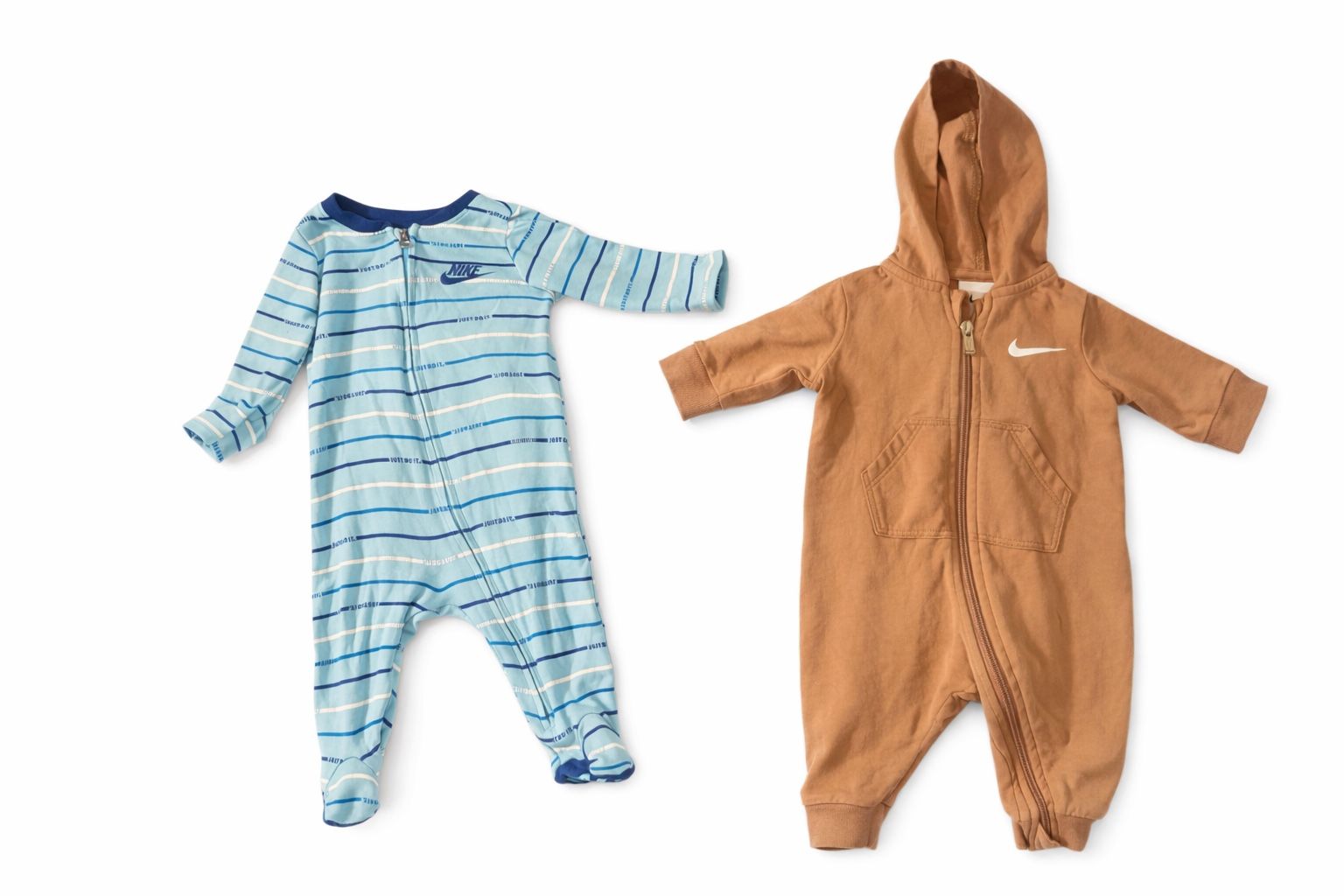 Baby clothes bundle in excellent condition. Includes 2 Nike baby outfits: • 1 blue striped footed onesie with zipper • 1 brown hooded Nike jumpsuit with zipper Very gently used, clean, and well taken care of. Perfect for a baby boy.