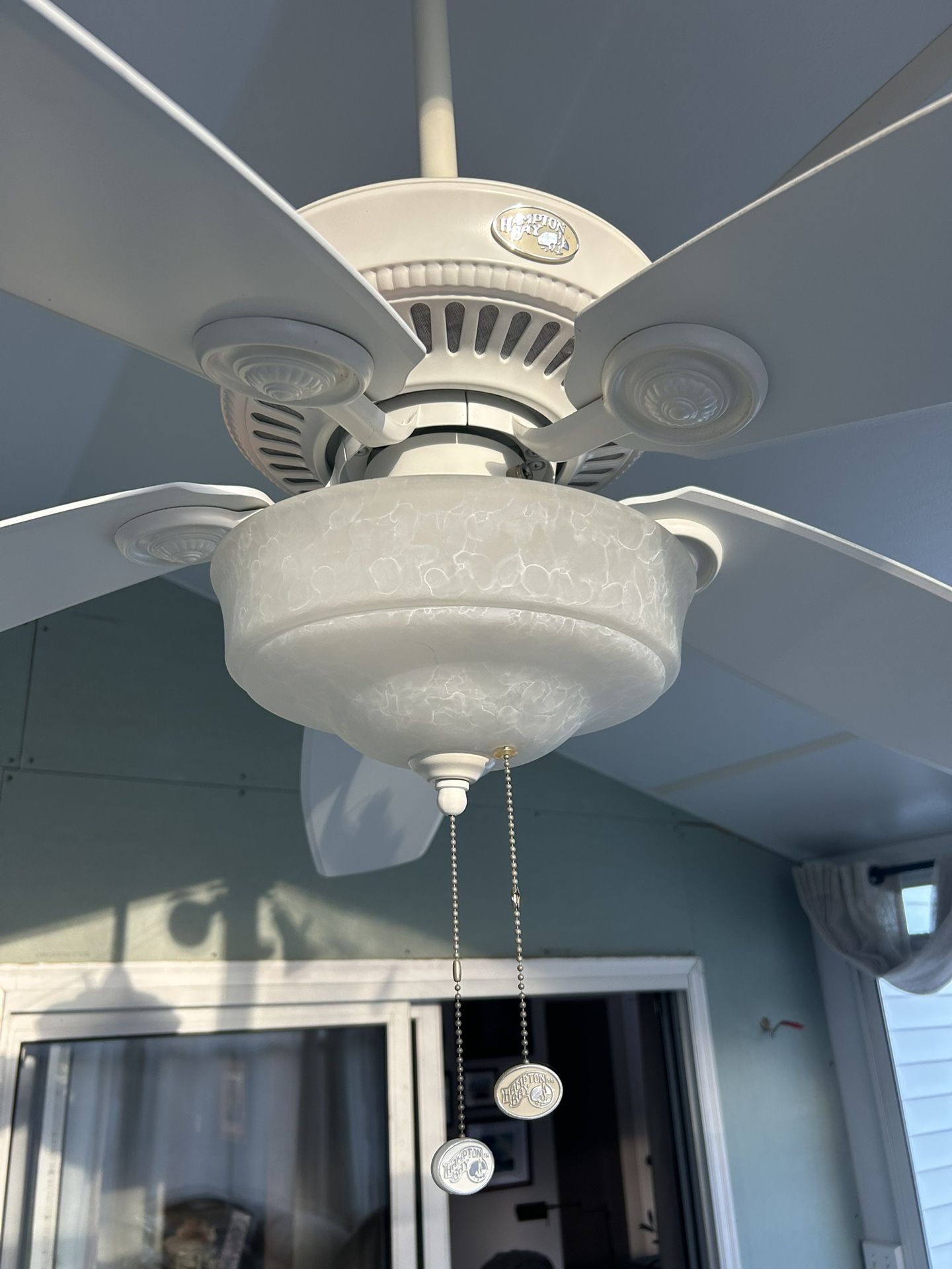 White Hunter ceiling fan with light fixture. 4 ft span / diameter. Remote. 3 speeds.