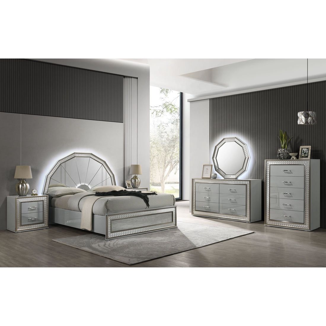 Experience modern elegance with the B92 Dubai bedroom set in metallic silver high gloss finish. Its sleek design features an LED-lit headboard and mirror, creating a stylish ambiance in your room. Designed for convenience, this set requires no box spring, making setup effortless.