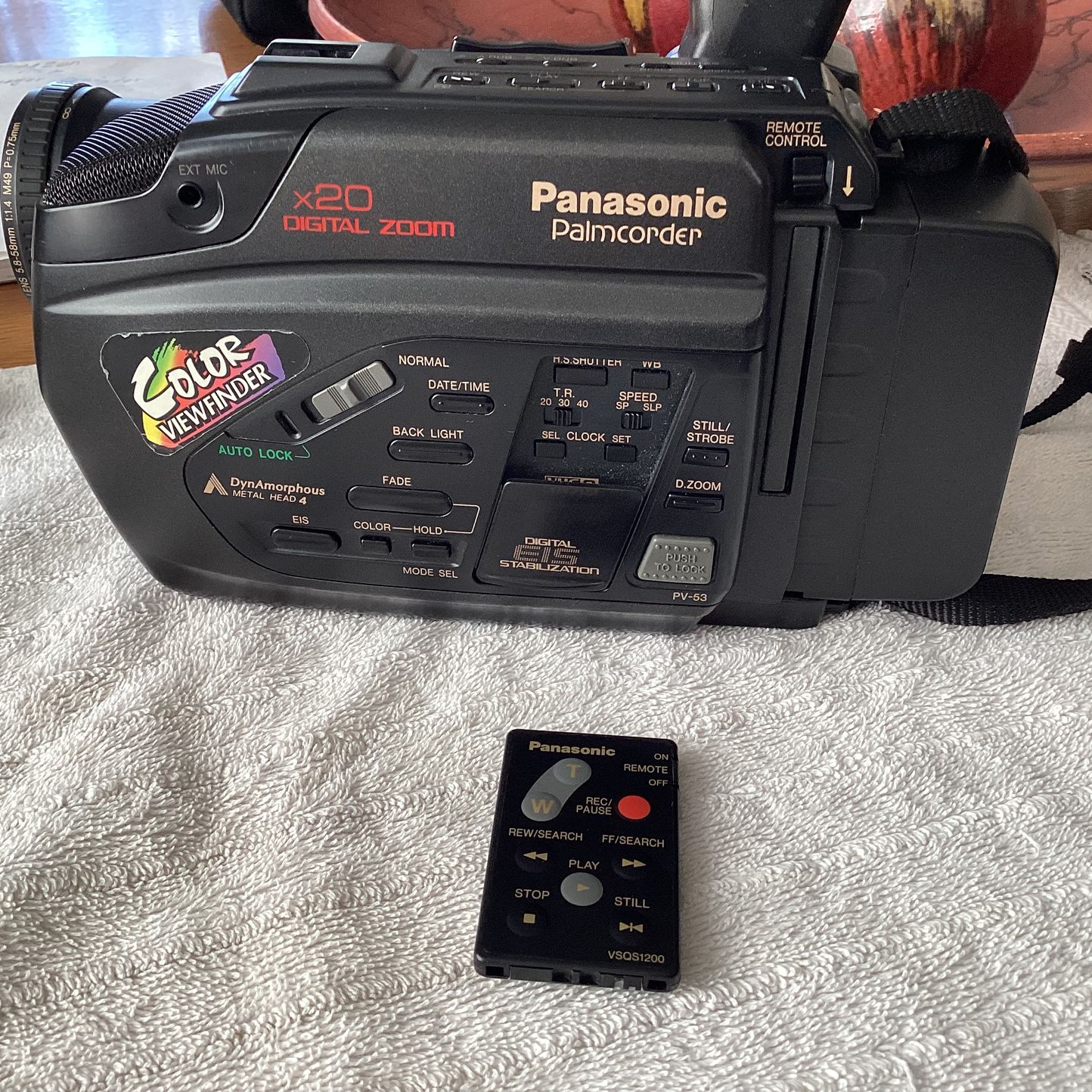 Vintage Panasonic Palmcorder PV-53 X20 Digital Zoom. Color View finder. VHS-C Compact Tape. Camera has remote control and Battery charger. *Has been tested* Located in Chandler 85225 Cooper Blvd & Ray rd * No Deliveries *