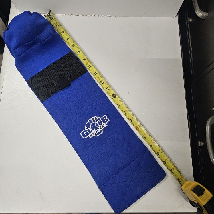 Baseball Glove Locker, a storage and shaping aid for baseball or softball gloves. It is designed to help maintain the glove's shape and pocket. The blue neoprene material provides a snug fit to keep the glove closed. The integrated measuring tape can be used to measure the glove's size or for other purposes. It is a training aid or accessory for baseball and softball players.