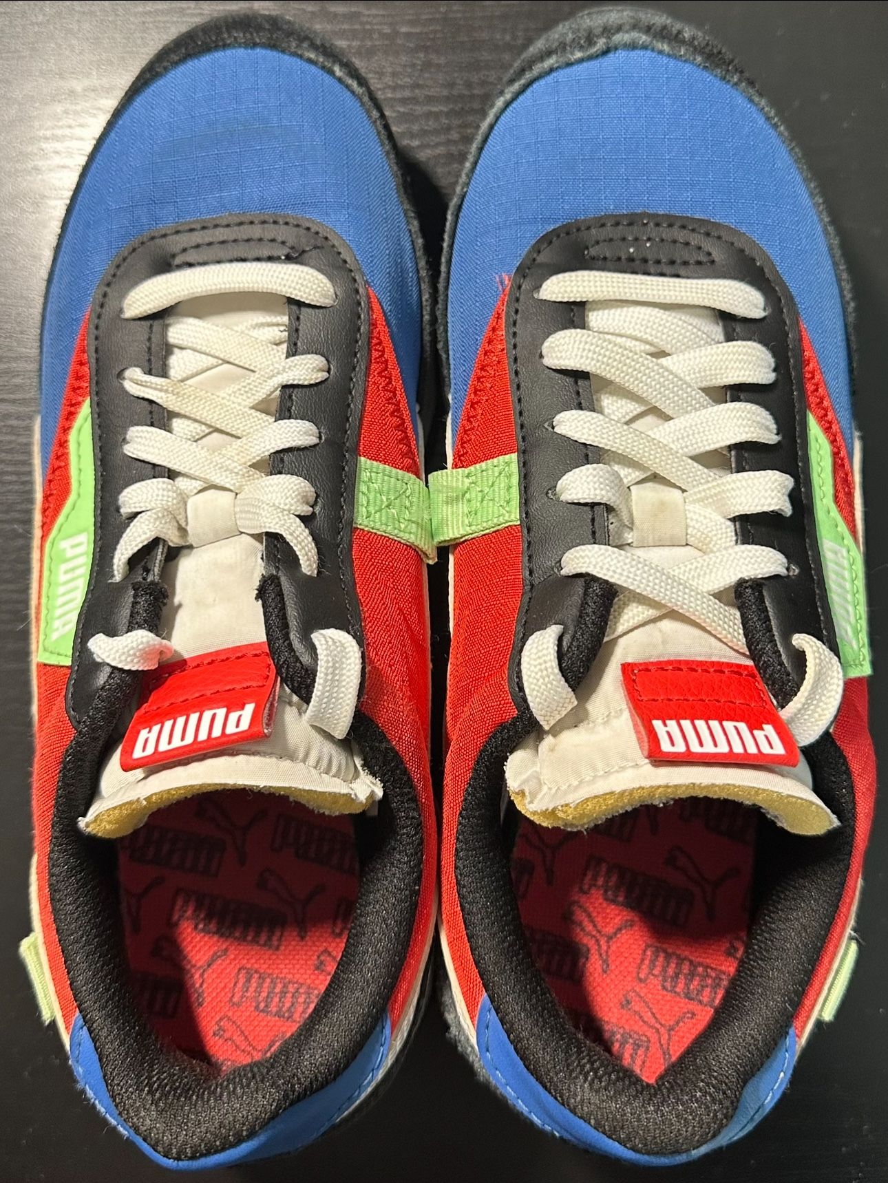 Puma boys sneakers shoes US size 4.5C Puma Boys Future Rider Play On Multicolor Running Shoes Sneakers 1980 the Fast Rider was one of PUMA s most comfortable yet simplistic running shoes with a super-light design and shock-absorbing Federbein outsole. Today they've revamped the Fast Rider as the Future Rider reborn for casual-cool street style with bold material play and colorblocking a slimmer outsole and ultra-comfortable Rider Foam. Ride on. All sales final.