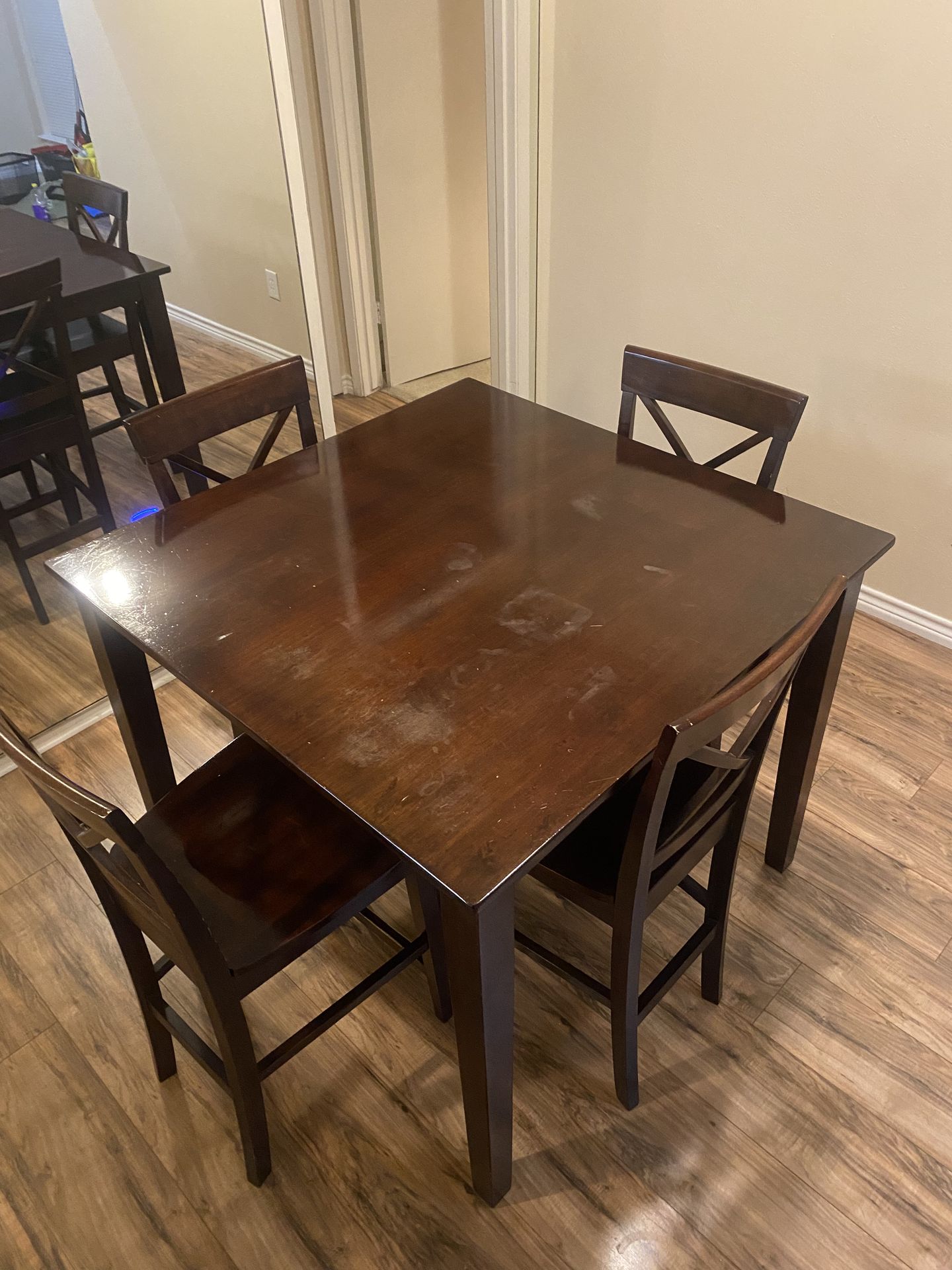 Cherry Wood Table w/4 matching chairs The table top does have some distress, but can be covered with placemats or a table cloth…very sturdy