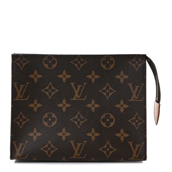 Louis Vuitton Monogram Toiletry Pouch 19. This cosmetic pouch is crafted of classic Louis Vuitton monogram coated toile canvas in dark brown. The pouch features an over-extended top zipper that opens to a beige leather like interior. Measurements are: Length: 7.25 in Height: 5.75 in Width: 2 in