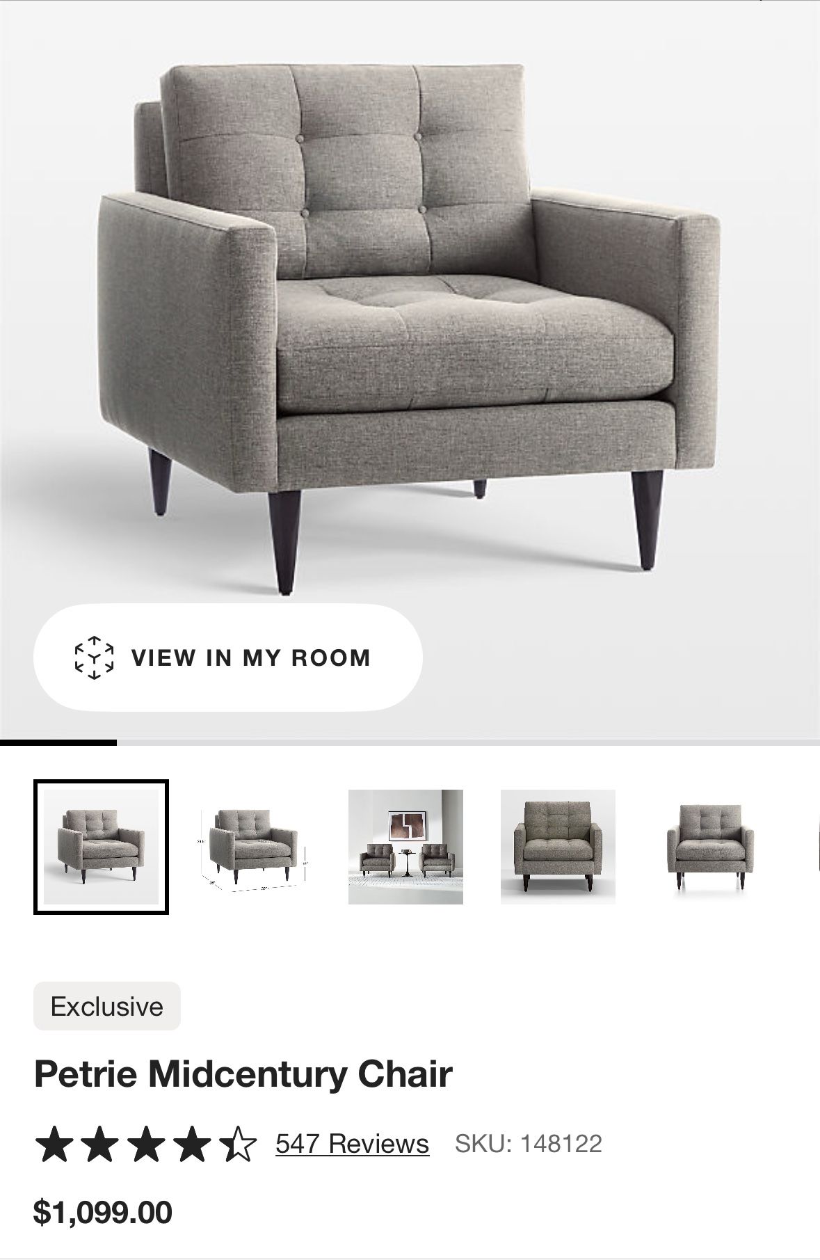 Crate and Barrel’s Petrie chair. Mid century. Needs new upholstery. 35 D x 36 W x 32 H.