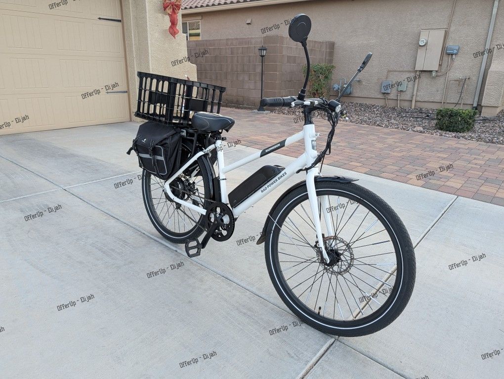 For sale is a Radmission 1 Mid-Step ebike/electric bike in white color. Ebike is in overall great condition and with only a few usage wear, with the most noticeable the rubber grips on the handle brakes that have developed a gap on each side (see last 2 photos). Comes with a saddle bag, crate, and 2 side mirrors. The seat was also changed to a more comfortable one. Key Specifications Motor: 500W Geared Rear Hub Motor Battery: 48V, 10.5Ah, 504Wh Lithium-ion Top Speed: 20 mph (throttle & pedal assist) Range: 25-45 miles Assist: 4-level cadence-sensing pedal assist Throttle: Half-grip twist throttle Weight: ~48 lbs (21.8 kg) Frame: 6061 Aluminum Alloy Brakes: Tektro Aries Mechanical Disc Brakes (180mm rotors) Tires: Kenda Kontact, 27.5" x 1.95" with K-Shield liner Drivetrain: Single Speed (16T freewheel, 50T chainring) Display: LED (battery level, assist level, lights) Lights: Integrated headlight & taillight (with brake light function) Cash sale only. Meeting place is at Pioneer Community Park at 8755 N 83rd Ave, Peoria, AZ 85345.
