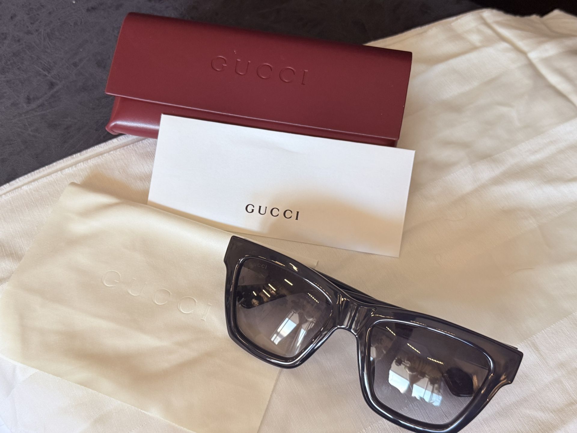 Stylish Gucci sunglasses, black frame with cool gradient lenses. Made in Italy, model R81LW06040. Comes with the original case and cleaning cloth. Classic style frame with a smoky gray gradient, lens brand new with leather case, cleaning cloth and COA. An essential for anyone’s sunnies collection! Asking for $180 or OBO Cash, Venmo, Cash App, PayPal and Zelle accepted. Shipping within California also available upon request. Buyer pays shipping cost. No returns, refunds, and/or exchanges. No scams, no frauds just a girl cleaning out her closet :) Feel free to check out my other listings! Thanks for looking!