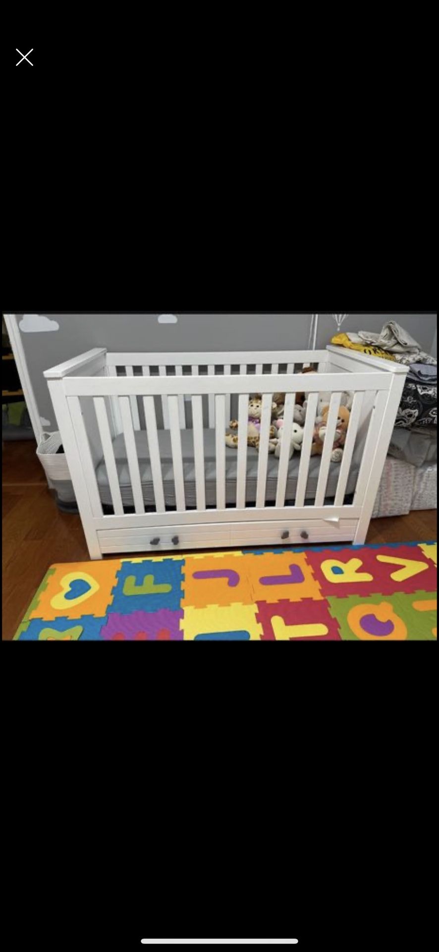 Our baby sleeps in our bed and this bed has NEVER. Been used. I would love for this to go to someone with more use. This set has a slide out drawer , toddler bed add on and crib conversion Purchased for almost $400 plus $70 for the mattress. Please message with serious inquiries only. Public meetup at Hoffman estates police department
