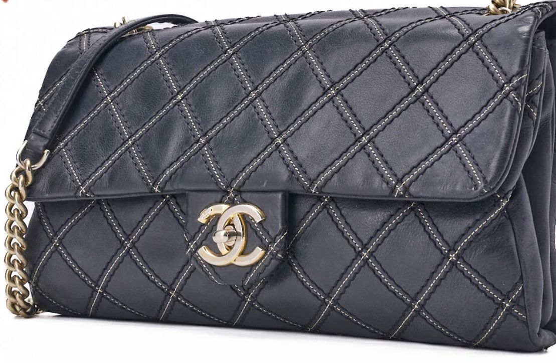 Chanel 2014 quilted shoulder bag circa 2014- calf leather • navy blue • calf leather • diamond quilting pattern • light beige topstitching • signature interlocking CC turn-lock fastening • gold-tone hardware • leather and chain-link shoulder strap
