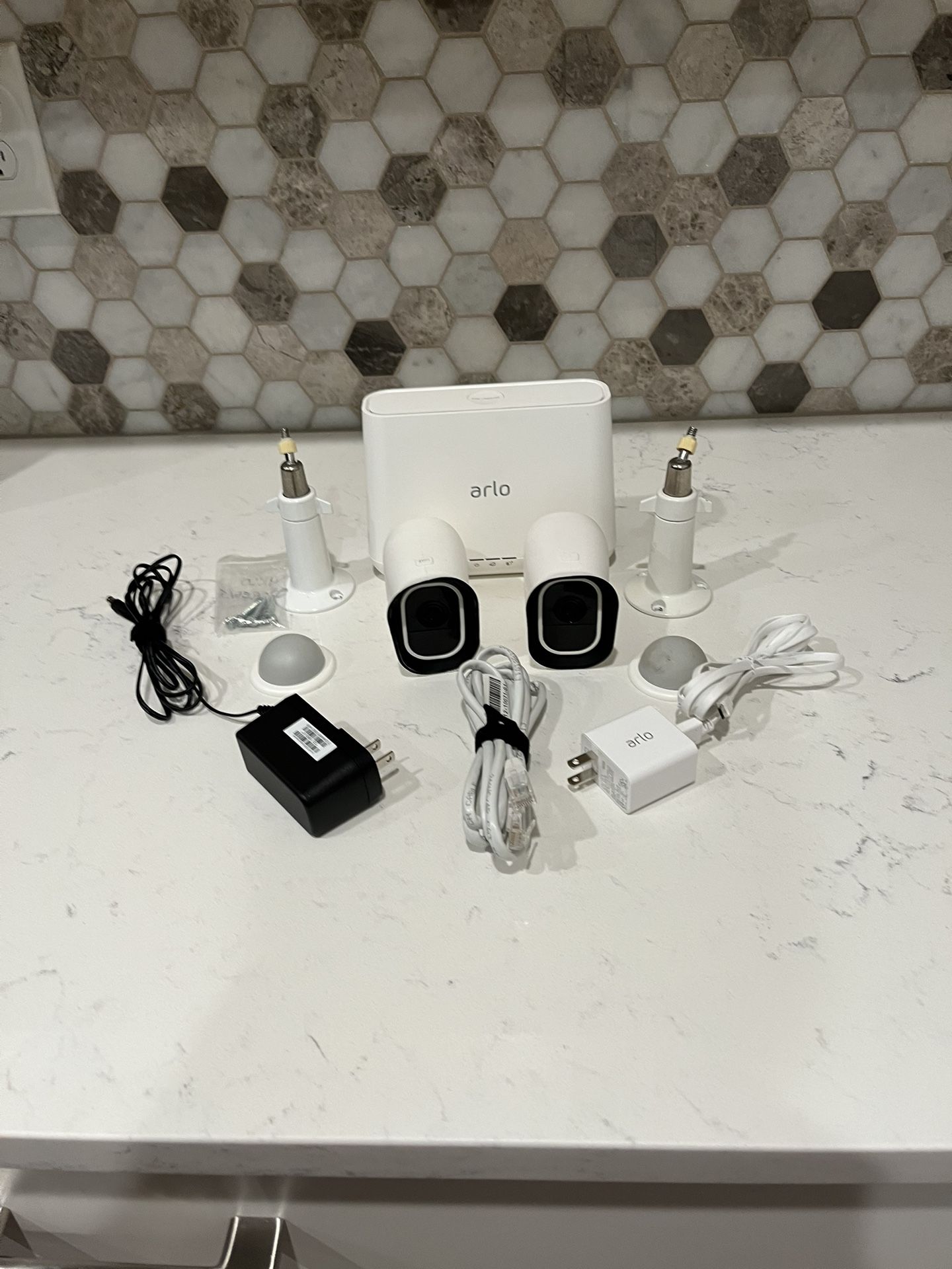 Arlo Base Station Model VMB 4000 Arlo Pro 2 Cameras (2) Model VCM4030P Camera Covers (2) Adjustable Wall Mounts (2) and Magnetic Wall Mounts (2) New Camera Battery (never used) Newer Camera Battery (1 year old) Charger Cable, Power Cable and Ethernet Cable