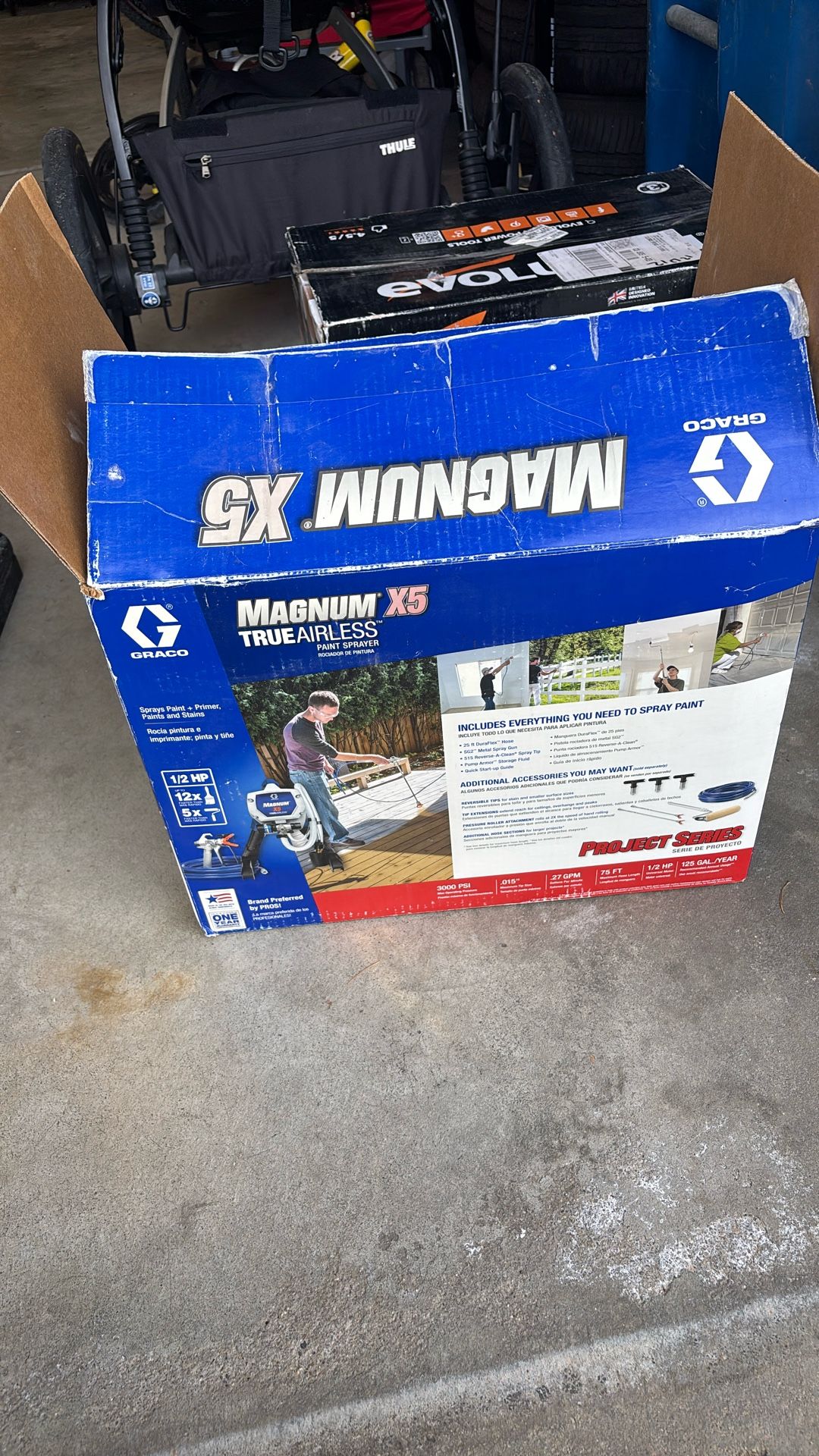 Graco Magnum X5 TrueAirless paint sprayer. Used for a few home projects and has been stored indoors. Great for painting or staining decks fences siding garages and interior walls. Sprays paint and stain directly from 1 or 5 gallon buckets. Strong consistent spray and much faster than rolling or brushing. Ideal for DIYers or contractors. Includes Graco Magnum X5 sprayer Spray gun and hose Original box Normal cosmetic wear from use, hasn’t been used in a few years but has been stored in the garage.