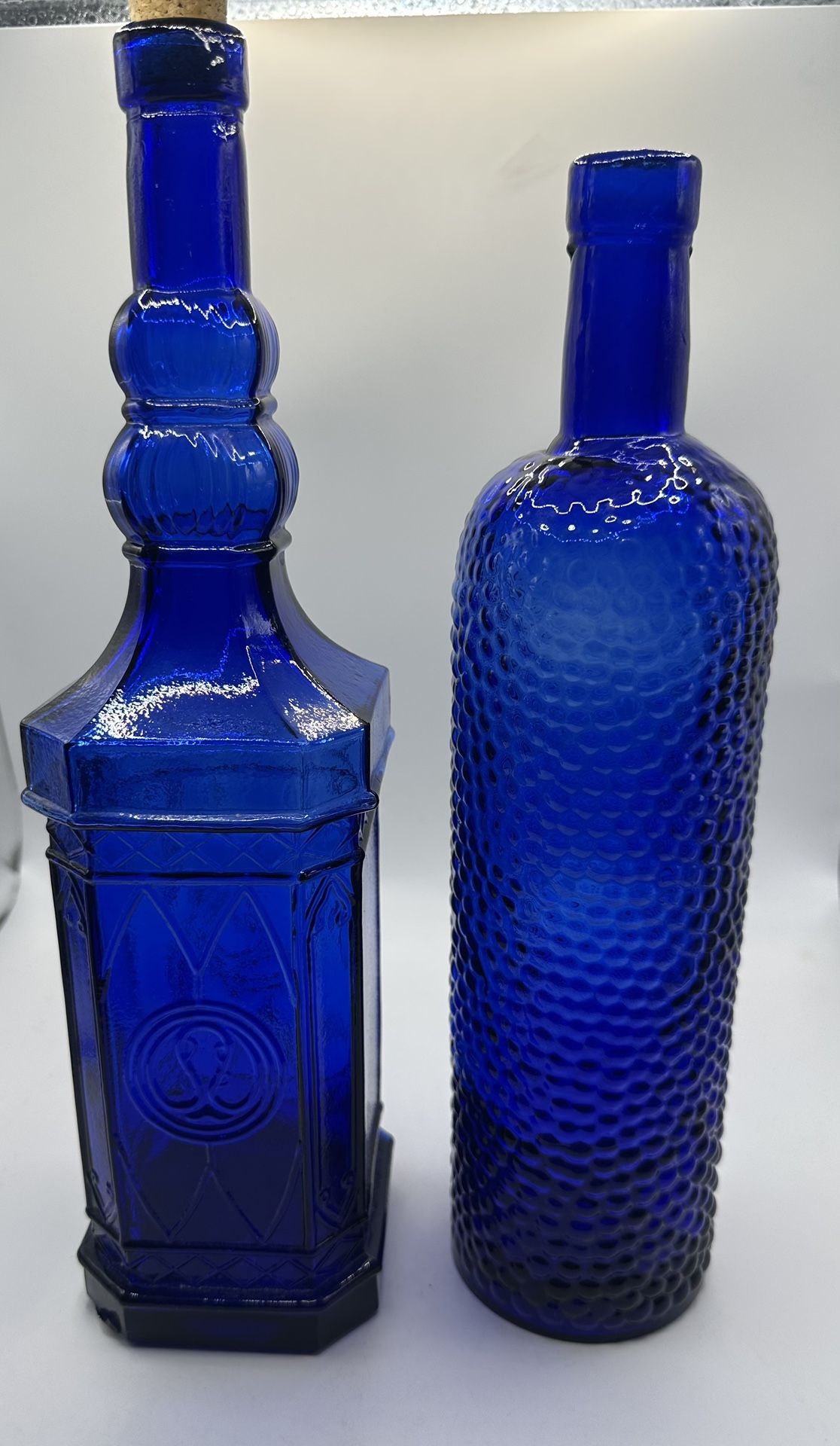 Cobalt Blue Ornate Recycled Glass Bottles Made In Spain Vintage Set Of 2