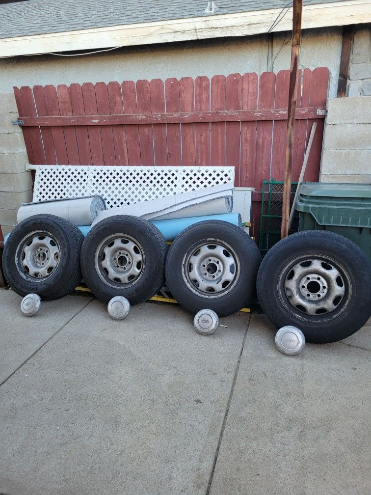 I'm selling 4 used rims and tires size 245/75/17. 2 are goodyear and 2 are general grabbers. Still have about 40 percent life one need to be patched it has a screw in it. Shoot me an offer