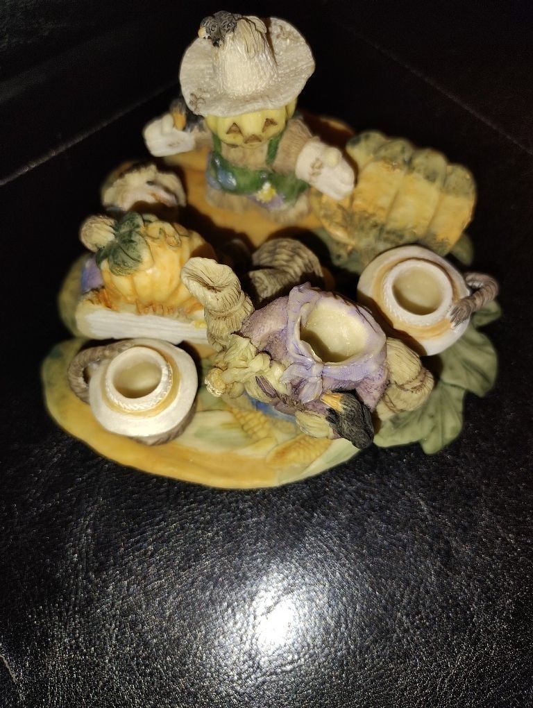 The product is a small multicolor resin figurine from a Fall/Halloween collection, manufactured in the 1990s. This figurine is unboxed and features seasonal themes, making it a decorative collectible for those interested in Fall/Halloween memorabilia. With its small size and detailed design, this figurine would be a charming addition to any Fall or Halloween-themed display or collection.