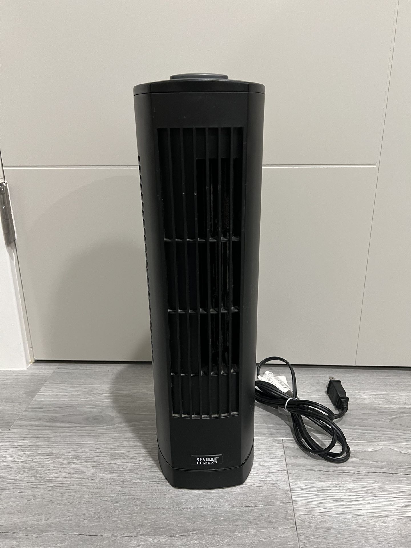 Cool Seville Classics black tower fan. Has oscillation feature and multiple fan speeds. Great for keeping a room breezy. H: 16.5“