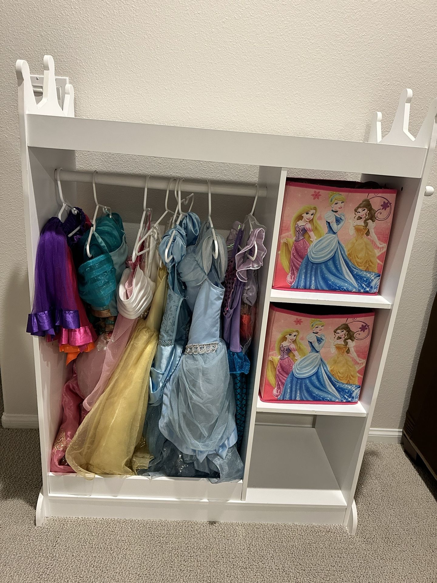 Armoire is in great condition, no broken pieces or cracks. This also includes all pictured dress up dresses and also has some headbands, jewelry, etc. A few of the dresses are authentic Disney (large Cinderella, Belle, Jasmine, and Aurora) Sizes range from 4-6 (most still fit my average sized 7 year old) No holds No delivery Cash only